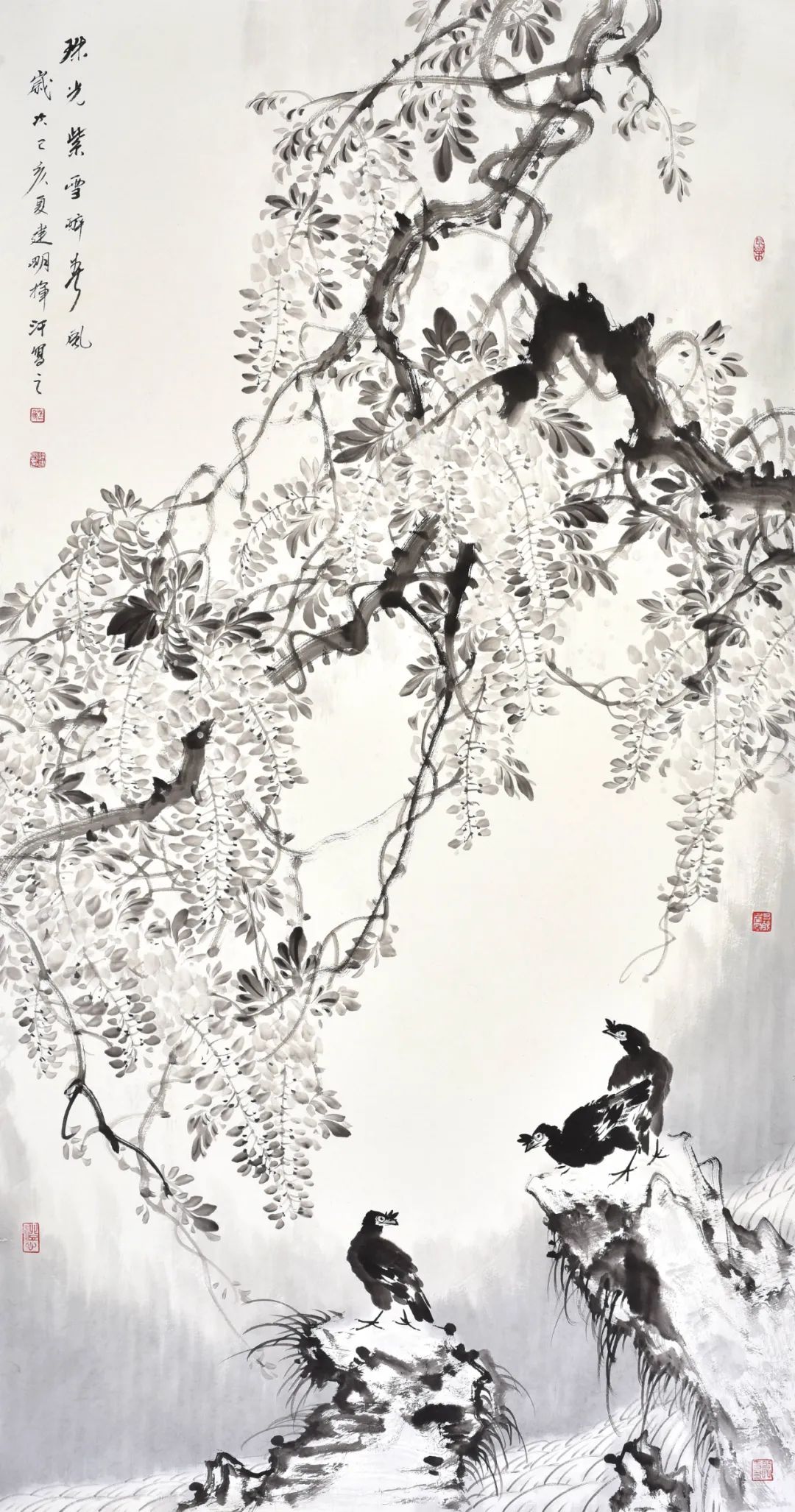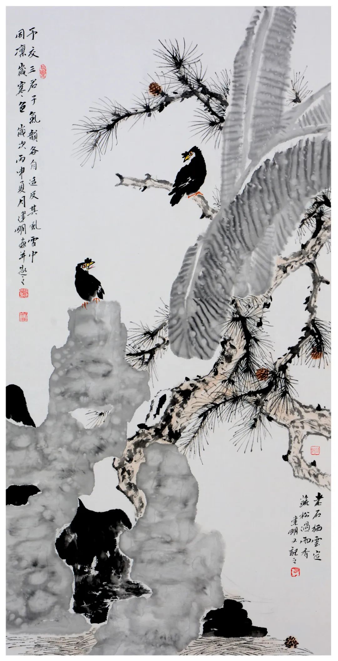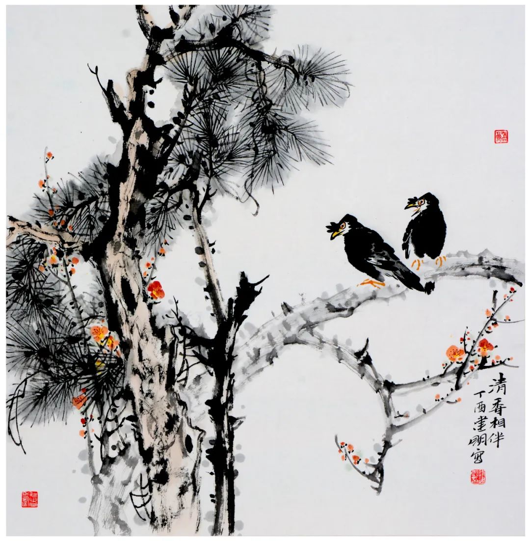 如其今年的新作《几颗珑缀晓寒降》,在画面的虚实、疏密、空白方面的展现都恰到好处。正是晚秋时分,寒凉已不知不觉来临,几株红花仍不畏严寒尽情怒放,一对小鸟立在枝头,隐约窥见宋代花鸟小品的古韵画风,足见作者对古代绘画名家著作的厚实阅历。虽作品以墨色为主,但那几点朱红点绛可谓点睛之笔。在树枝与叶片之下,淡墨色恣意又克制的晕染开来,形成了达观的虚实结合、以虚衬实的效果,同时整幅作品着墨处不多,充分的空白也塑造了神秘高远的艺术境界,给予观画者更发散、更宽广的思索空间。