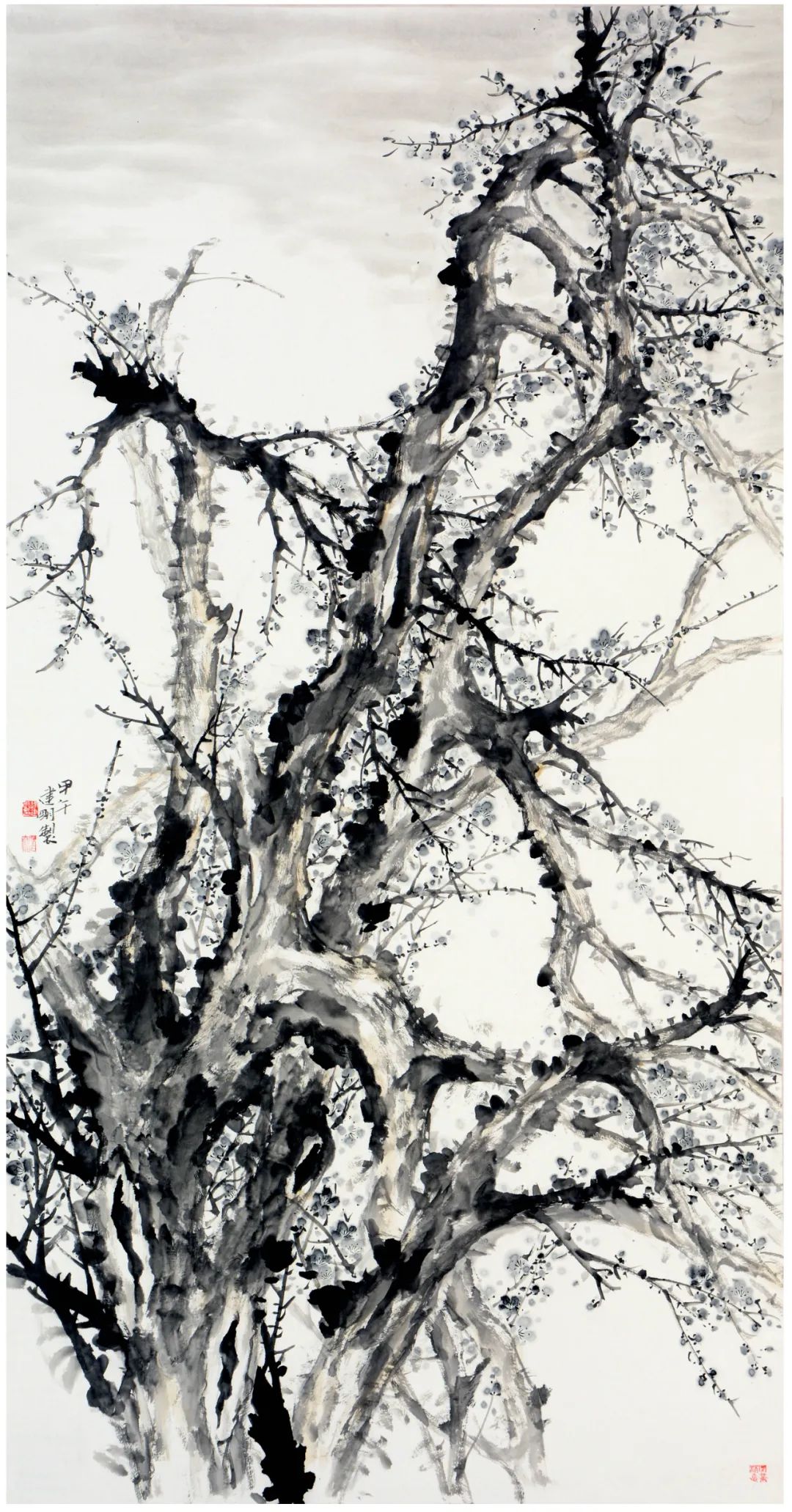 明朝鲁宗贤曾高度评价以墨梅开辟写意新高度的王冕:“古今画梅谁者高,前有补之后王老。”逄建明的《王冕诗意图》,可以看做是对这位花鸟巨匠的致敬。梅花是决绝对抗寒冷的典型代表,画中梅花星星点点的密集枝头,却并不诡谲肆放。笔墨精致而不寡淡,意象清冷而不孤傲,不显山不露水地展现坚忍品质与高洁芬芳。
