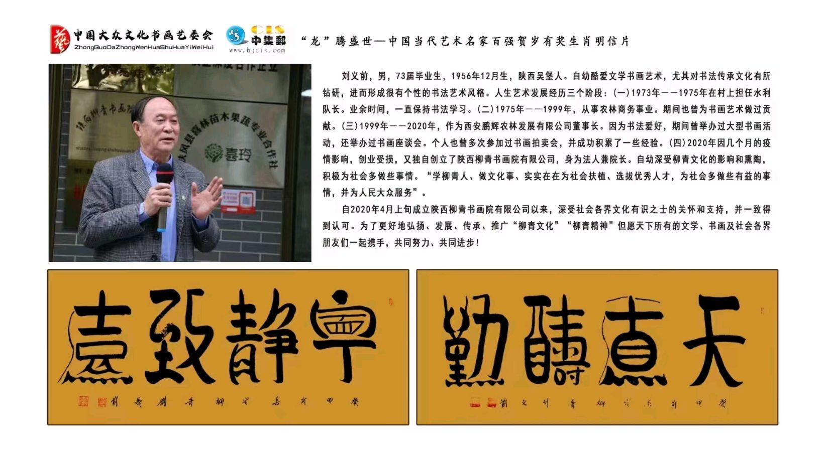 自陕西柳青书画院有限公司成立以来,在传承与发展地方文化的征途中取得了显著的成成。日前,关于中国大众文化书画艺委会,中集部“龙”腾飞盛世一中国当袋艺术名家百强贺岁有奖生肖明信片,中国当代著名书法艺术家刘义前老师”及其所属的陕西柳青书画院有限公司的最新动态引起了社会各界的广泛关注。