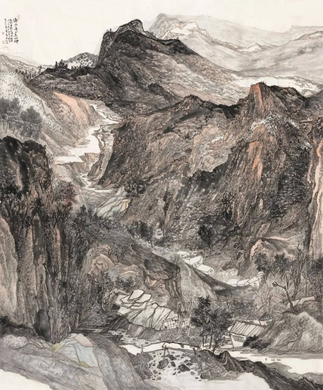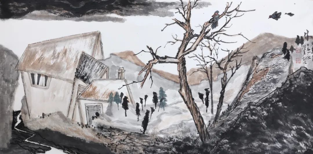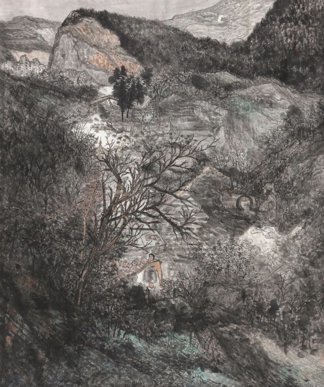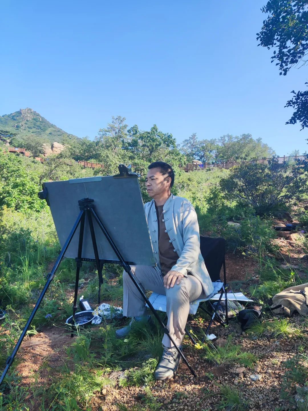 山水画作为国画古老传统题材绘画之一,传承至今已有几千年的文化历史,是我们文化艺术文明的精神展现。写意山水画是把自己的情感灌注于山水画中,不追求形态的宛似,而是更加注重意境的表达。刘学东老师生活在北方,对家乡的山水林田都有着深深的眷恋,无论走到哪里,都不能忘记家乡的特有山坡,他说:“我经常静静的看着老家的山林坡石好像和他们在一起有说不完的话,这也是自我体认和反观自己的途径,他同样可以折射出人的一种精神状态和人生境界。山水可居可游,你身体的一切感知,都可以与自己内心相关照,获得精神上慰藉和参悟,人与自然一体,坐穷观化,澄怀味象。尤其是塞北这片从小玩耍的沟沟坎坎,每次都留恋不倦,这可能也是我后来喜欢画山水的内在原因。”一个画家所思与所画,应当与他的从小经历是一个有机整体。尤其是那抹不去、淡不了乡愁。自古以来,山水画的创作为众多画家所青睐,取得的成就也最大,原因是山水最能表现自然的正大、纯朴、高峻、挺拔、瑰丽,突出地呈现生命的强悍与不羁,从中反映画家对事物、生命的审视态度;另外一个原因是山水的形状各异,富于变化,为画家提供了施展才能及想象的空间,能够充分发挥其特长,表现自我特征,达到画者与山水的互融,形成笔墨既画人生的崇高境界。我们在这里期盼着刘学东老师的无限乡思幻化为千笔万墨,书写的是山,吟唱的是诗!