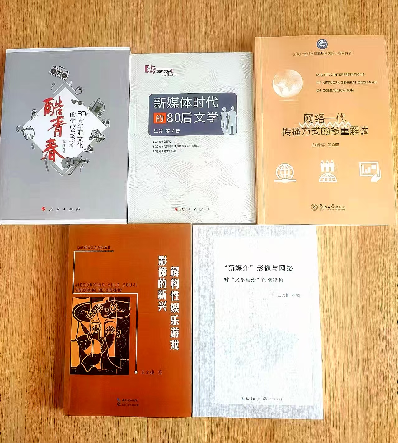 江冰等著《新媒体时代的80后文学》《酷青春:80后青年亚文化的生成与影响》,熊晓萍等著《网络一代传播方式的多重解读》,王文捷著《解构性娱乐游戏影像的新兴》《新媒介影像与网络:对文学生活的新建构》《基于媒介融合的文学生活》等,三个国家社科基金及多个省级资助课题的引导,促成了上述系列成果的产生。
