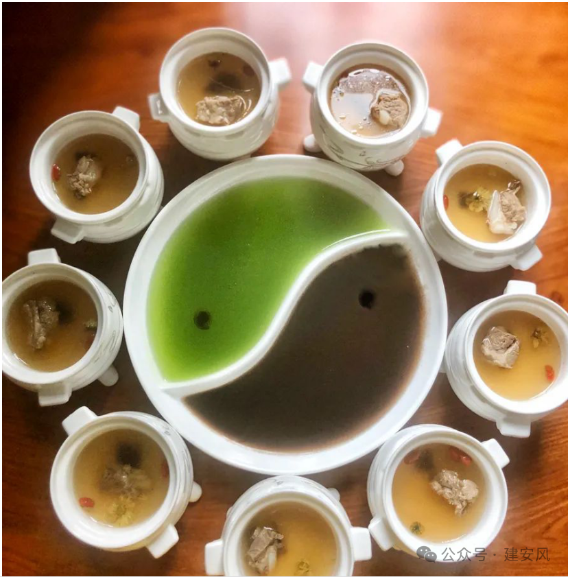1993 年7月,首届海峡两岸疑难病特色疗法研讨会在厦门召开,海滨石舫上的鹭江药膳真是美味绝伦。大堂里坐一位鹤发银髯的老中医先为食客一一把脉,然后根据食客体质的虚实寒热,虚则补之,实则泻之,寒者热之,热者寒之,因人制宜。坐定之后,导食小姐先端上温热的人参灵芝酒和一个益寿冷盘,均为一些药食两用、营养丰富的家常菜蔬,如铁棍山药、紫苏莲藕、凉拌荆芥、丝瓜秧尖等。冠心病人建议你多喝薤白瓜蒌黄瓜汤、有呼吸道疾病的人可食凉拌鱼腥草和桔梗炖黄喉,脾胃虚寒则以山药、猴头菇等与猪肚同炖,不温不火;年老体衰,则建议你进补葱爆海参和黄精煨鲍鱼,温而不燥。慢慢品着香甜的黄酒,枸杞醉虾、冬虫水鱼、银杏南瓜、双花芹菜,紫苏甲鱼、茯苓小笼包等伴随着精美的紫砂器皿依次上来,那一道道做工精致、点缀得当、栩栩如生的药膳菜肴,散发着袅袅的中草药清香。食客各食所需,清热、活血、强身、健骨、理气安神,美容养颜,这不仅仅有一种浪漫的南国情调,更是一种养生健身的超值享受。