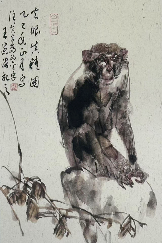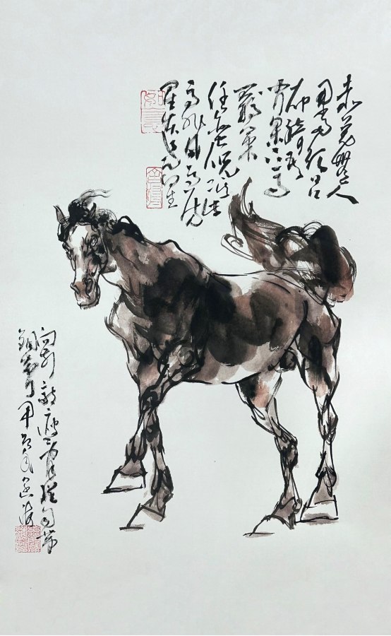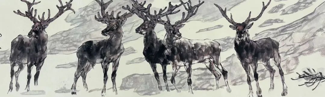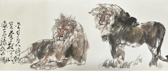 王阔海先生的动物画系列,在当今画坛,能与之比肩者可谓稀如凤毛麟角。他的动物画,形体结构准确到位,画面气韵生动,这源于他在细致研究西方大师素描的基础上,成功的研究出为中国画笔墨服务的中国画素描,作为中国画造型落墨的依据,并且提出以线为主、明确结构、线面结合、塑造形体的中国画素描四大学术理论。面对物象如何用线,如何施墨才能更好地表现形体和塑造形体,如何做到笔墨与形体如影相随与形影不离等问题,形体因笔墨而彰显,笔墨因形体而灿烂,感觉有的形体还可以深入刻画塑造到可触可摸的境地,造型既强化夸张又生动准确,下笔直取,从不打稿,如有神助。这大大超越了前人中国画的刻画塑造能力。