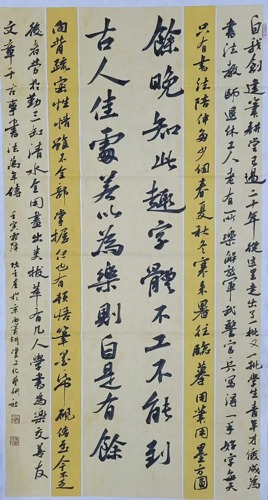 从2000年创办笔耕堂搞书画培训,先后培训大,中,小学生,退休人员,解放军武警官兵。和一些学校的书法教师