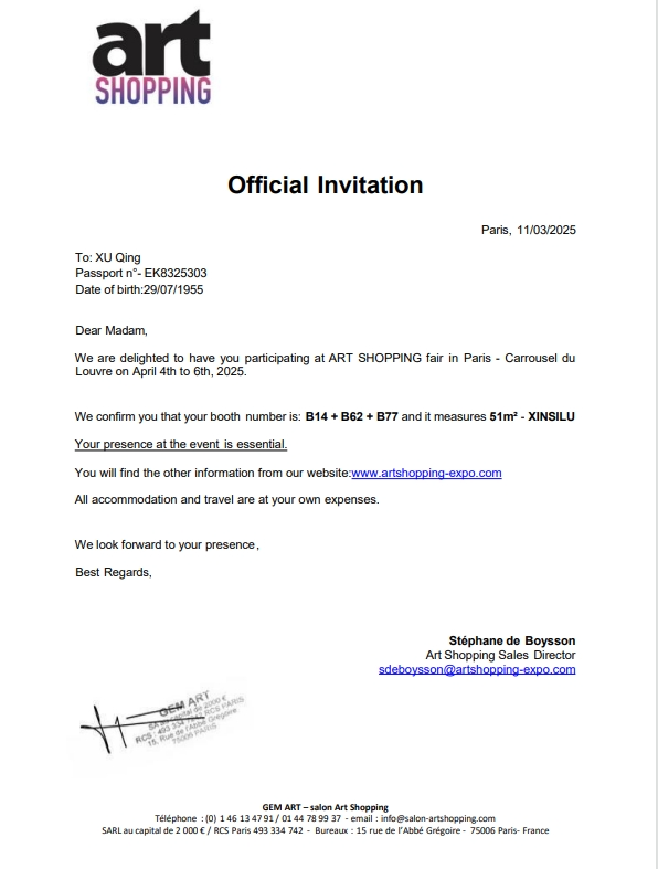 我们很高兴您能参加巴黎卡鲁塞尔杜艺术博览会2025年4月4日至6日,卢浮宫。我们确认您的画展位号为:B14+B62 B77,您出席活动至关重要。(我们的网站:www.artshopping-expo.com)。我们期待您的光临,顺致敬意,