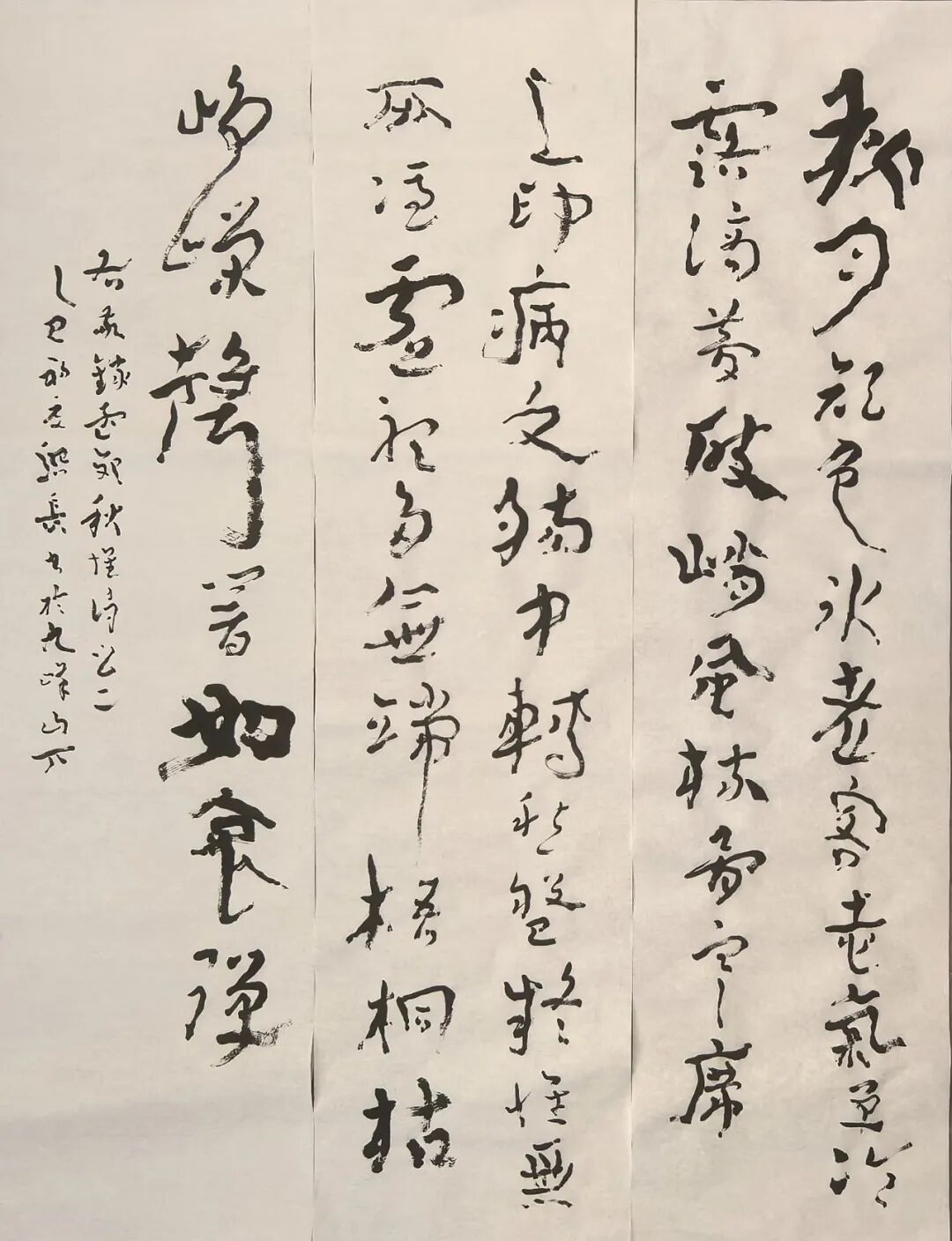 开头的“秋月”二字,情景交融,秋字左部高耸入云,有伟岸之感;右部火字下压,悲凉之秋扑面而来。月字从古篆化草,空远旷无,一开笔就扣人心弦! “无所凭”之所字的右部,让读者不由想到孟郊衣衫褴褛躺在病床上,伸出右手,对天地诉说自己不幸的遭遇。凉凉的秋意与带病的无奈流露于作品的字里行间。末句的“声”字之涩笔及破锋收锋与起笔向上出锋,如闻《广陵》;“如”字重墨,“哀”字如君子高直,虽哀仍有节,切入诗歌作者当时“奋力抗争”的主题感。字里行间,处处卓而不群。