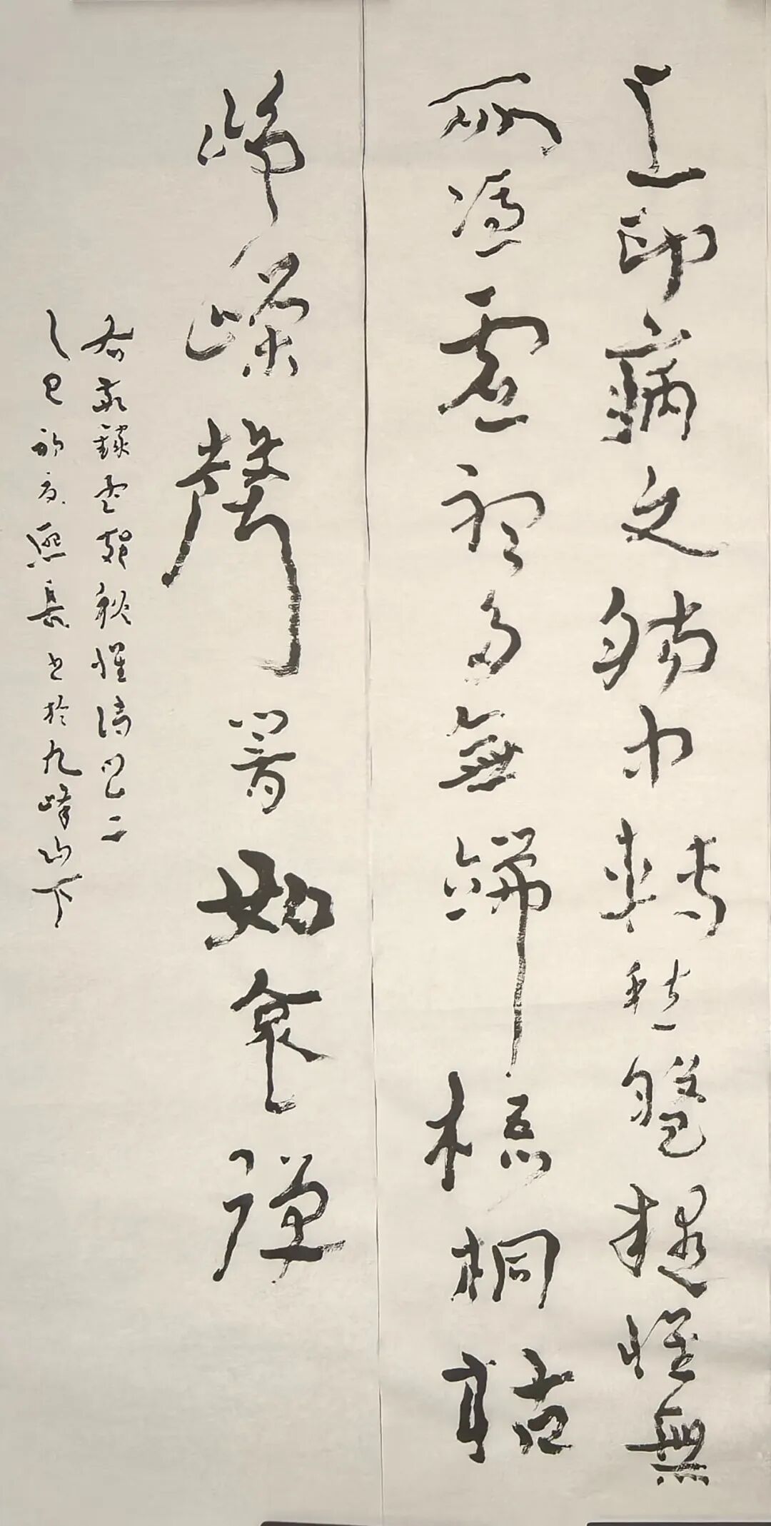 尤为重要的是其“不而”笔法:不求工而工至,不求拙而拙成。“行笔似冬夜初雪飘下”,在“有迹与无迹间践行空灵境界,甚至左手书写的《瘗鹤铭尺八屏六条屏》更显萧散无为。”看似无为的境界,实则是对标准化审美的颠覆。这种超越技法的书写,恰如孟郊的苦吟,将技巧隐于情感之后,以“无意于佳乃佳”的姿态完成艺术抵抗。