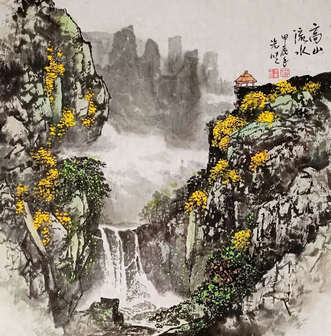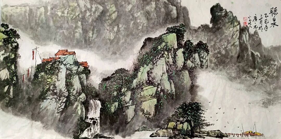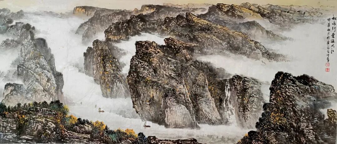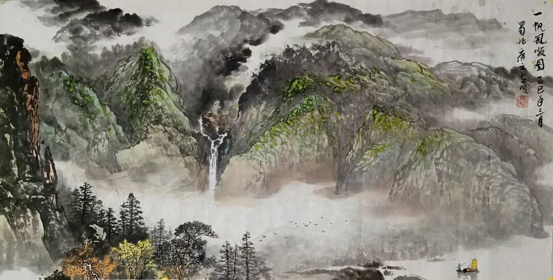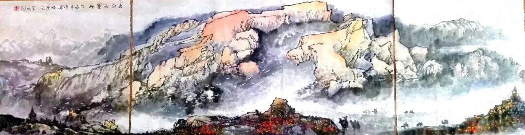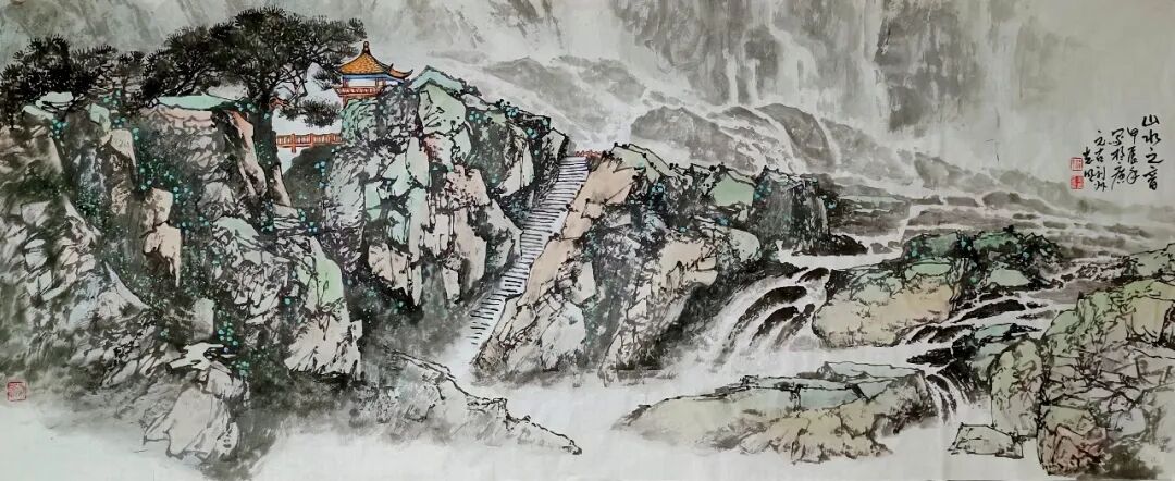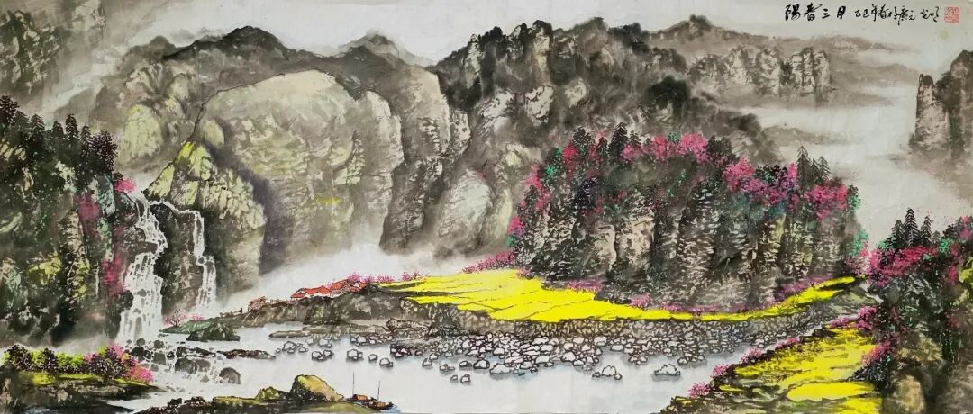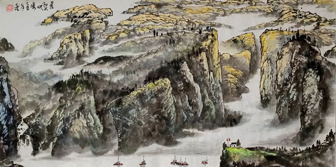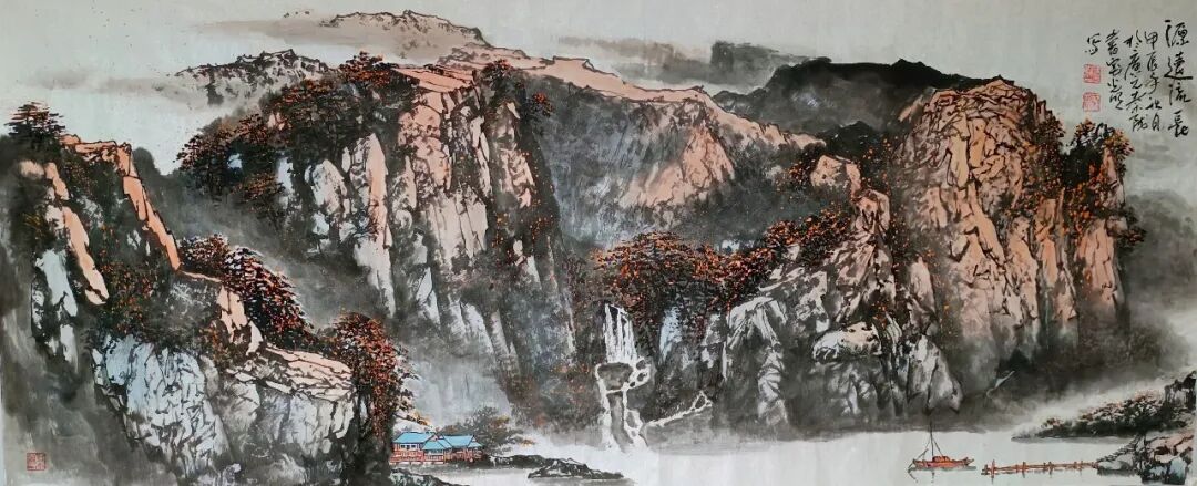 看蒋光明先生的山水画,第一印象就是气势之恢弘!横幅绘就一番大气磅礴的山水美感,此正如古人论画云:“大者巑岏,不凿其真,夫惟胸涤尘埃,纵横而出矣!”例如他的这幅《源远流长》图,画中峰岩跌宕宏阔,是谓尺幅千里,欲穷千里目!用笔皴法层层叠加,赋色着意敷染得宜,实乃操笔如在深山,居处如同野壑,可以尽显山林真面目也!鹰呼峡壁如斧刃凿劈,平畴积霭见云烟生起,曲径处自有屋舍隐居,山涧处更闻溪声寂寥,绘染山川,岩幛奇丽,大家画品,正当如是!