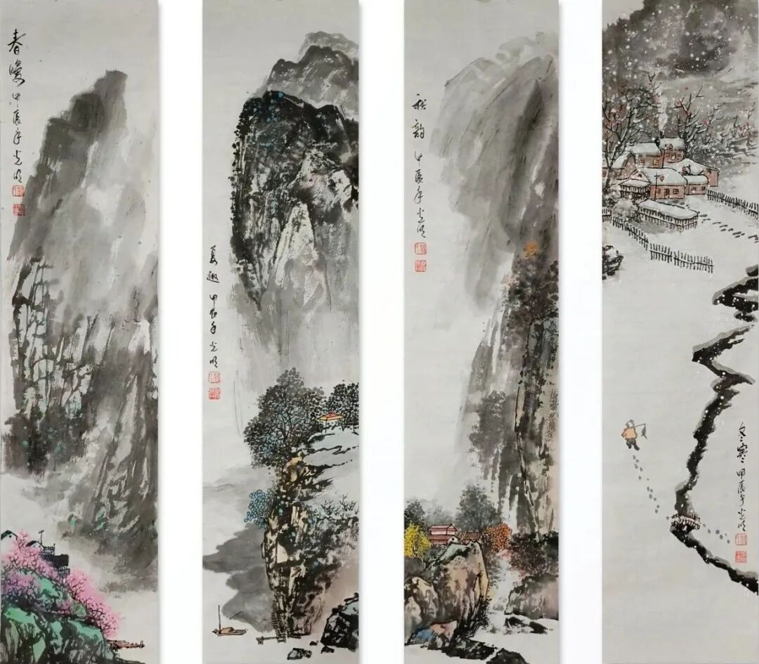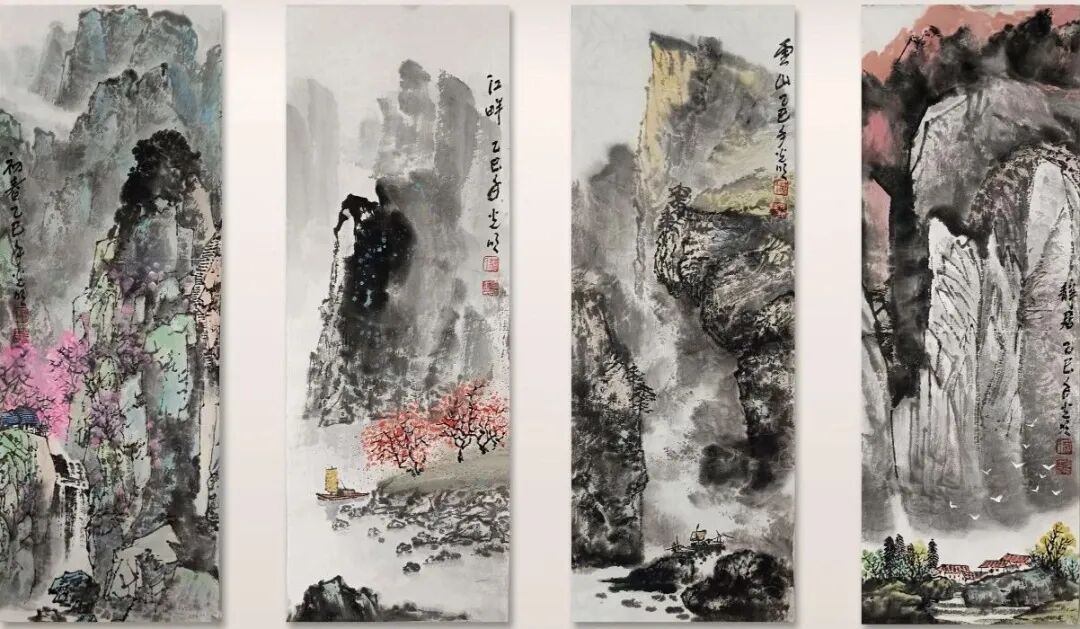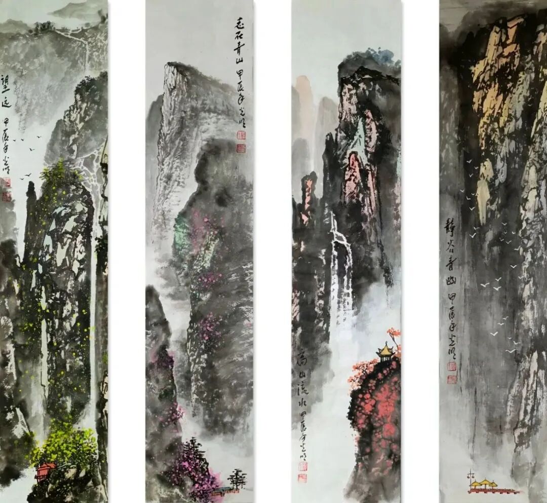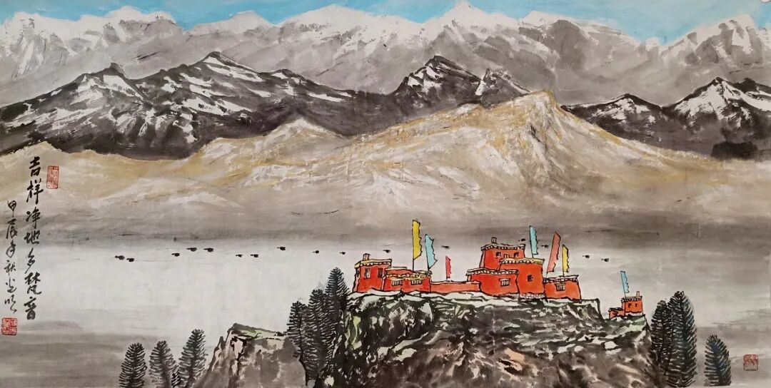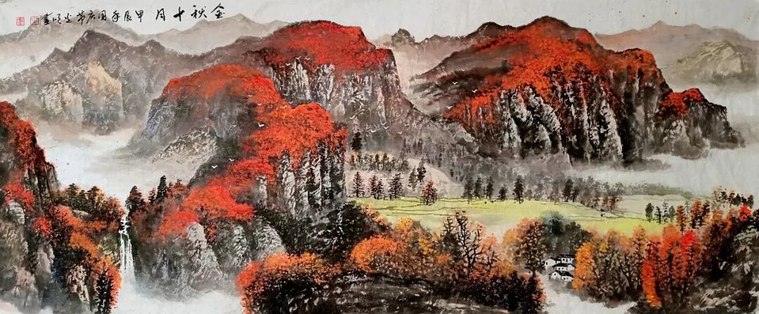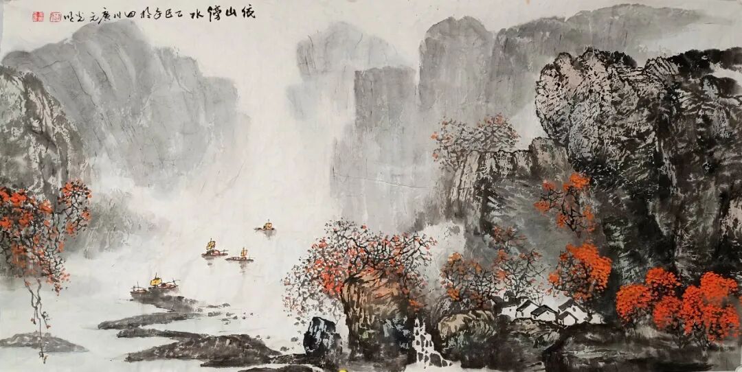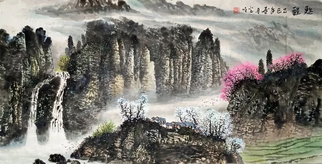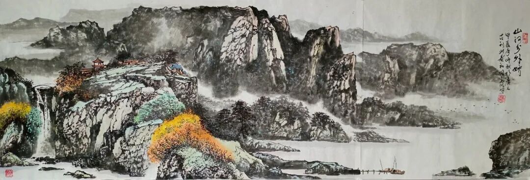 看蒋光明先生的山水画,第一印象就是气势之恢弘!横幅绘就一番大气磅礴的山水美感,此正如古人论画云:“大者巑岏,不凿其真,夫惟胸涤尘埃,纵横而出矣!”例如他的这幅《源远流长》图,画中峰岩跌宕宏阔,是谓尺幅千里,欲穷千里目!用笔皴法层层叠加,赋色着意敷染得宜,实乃操笔如在深山,居处如同野壑,可以尽显山林真面目也!鹰呼峡壁如斧刃凿劈,平畴积霭见云烟生起,曲径处自有屋舍隐居,山涧处更闻溪声寂寥,绘染山川,岩幛奇丽,大家画品,正当如是!