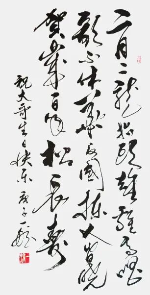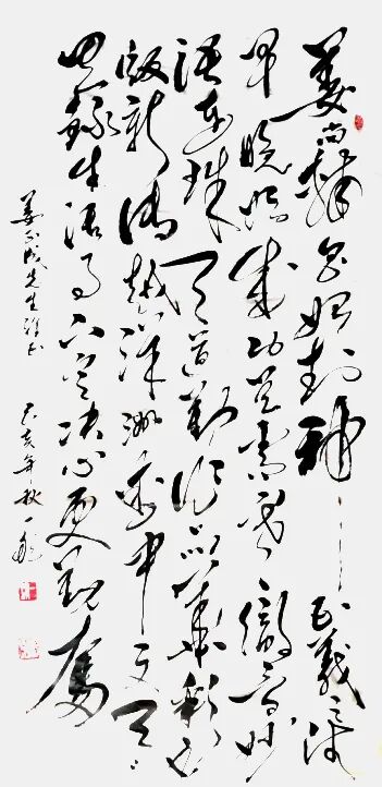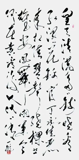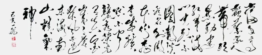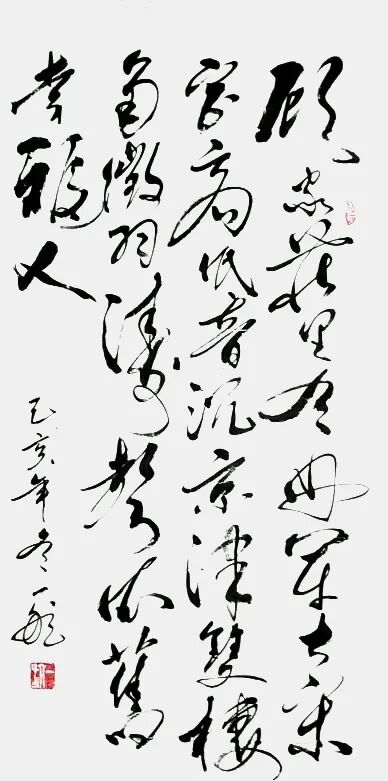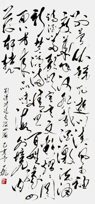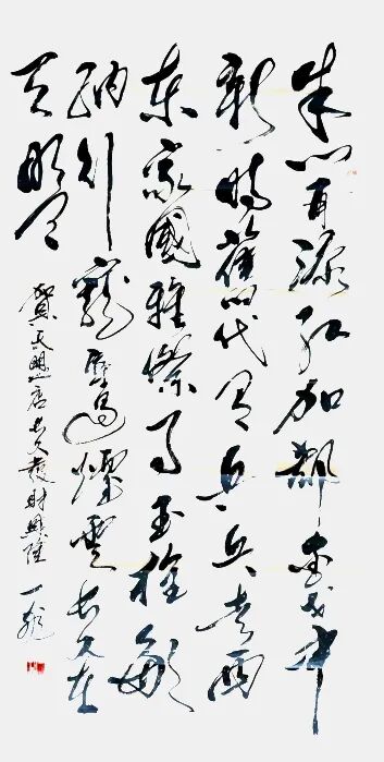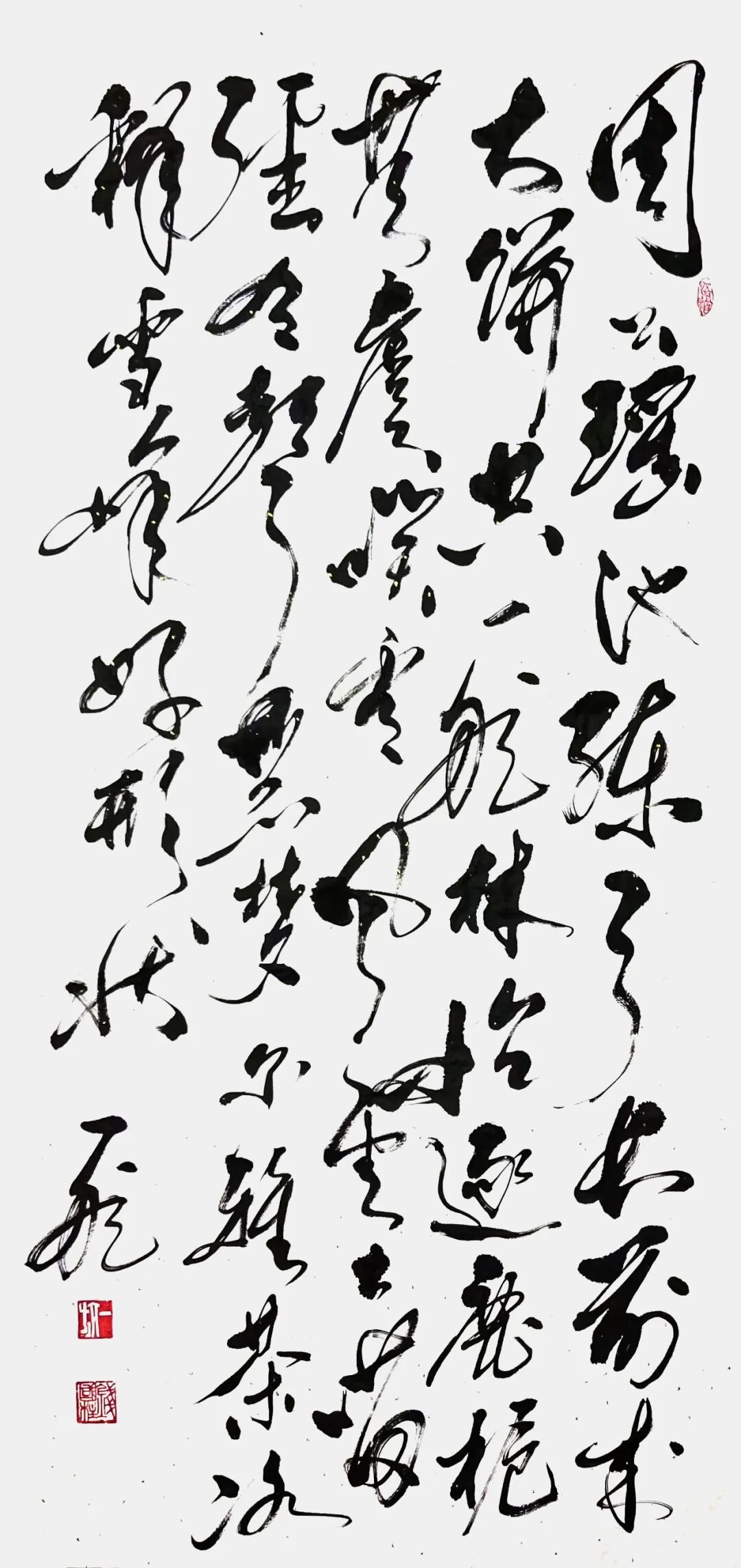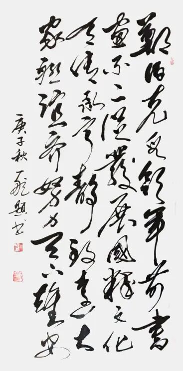 看他的书法,真可谓不羁其形,不作矫饰,惟以性情驱笔,在点画使转间将“自运在服古,临古须有我”的翰墨之道参透至极。笔笔洒脱而无匠俗之弊,字字雅健而无凝滞之势,此正如古人所言书论,即笔落纸上,精神能冲其中,气韵目晕于外也!取法以二王立根基,又能深谙癫张狂素之笔意,推崇米芾之真气,由此集众家之所长而化为己用,自是不在对临,而在于神会,遂令性情奔会腕下,章法透入肝膈!常言学书六要:气质、天资、得法、临摹、用功、识鉴。今看钱国柱先生书功,正是得此六要俱备也!