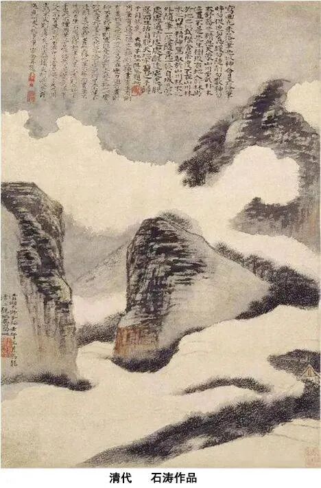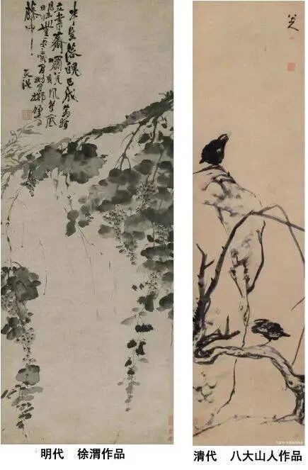 再经至明代“集文人画理论大成”的“体制内”的“文人画”大家董其昌在画论中提出一种“非功利性”的,“以画为寄,以画为乐”,“不为造物役者”的“文人画”艺术创作态度的名论,以及开创“扬州画派”的祖师,“体制外”的“文人画”大家石涛所主张的“夫画者,从于心者也”、“我之为我,自有我在”的,张扬自我个性为主导的画论影响之下,使得山水画以至花鸟画之后都更为趋向于最大限度地抒发作者主观情感,表达“独立精神”和“自由思想”之艺术。故“文人画”更为趋向于“表意”、“写意”的艺术方向发展。就“画法”上来讲,从元代的中国画开始,就是从之前的以“描法”为主导向着以“写法”为主导的转折点。所以明清的“文人画”更加趋向于以“书写性”的“写法”为主导的,以“表意性”、“写意性”的“绘画艺术语言”表达作者的思想情感和审美理想的方向发展。而“写意花鸟画”经自明代开创“吴门画派”的祖师,“体制外”的“文人画”大家沈周到其再传弟子,也是“体制外”的“文人画”大家陈淳,再至“心学”宗师王阳明的再传弟子,“特行独立”的“体制外”的“文人画”大家徐渭,将“写意花鸟画”推向一个艺术高峰。再到了清初同样是“特行独立”的“体制外”的“文人画”大家八大山人,又将“写意花鸟画”推向另一个艺术高峰。在中国画史上,徐渭和八大山人是被后世公认为明、清两代在“写意花鸟画”艺术方面上最具开创性贡献的“文人画”大家。可以讲“独立精神”和“自由思想”在这两个大家身上及其画作中体现得最为淋漓尽致!对于近现代中国的“文人画”大家之影响巨大深远。被誉为清代“文人画最后的高峰”,现代“文人画”大家陈师曾、王个簃、潘天寿的老师,在中国画的“传统”与“创新”方面作出开创性贡献,具有“承前启后”历史意义的“海上画派”祖宗师之一吴昌硕,他在艺术上受到最大影响和启发的就是“青藤”(徐渭的“号”)和“雪个”(八大山人的“号”)以及“清湘”(石涛的“号”)。所以吴昌硕自言“于画嗜青藤、雪个”,“青藤、雪个呼不起”。大有自恨不与徐渭、八大山人同生,无法使他们起来观看自己作画的遗憾。对于石涛也是极为佩服,故他有“几回低首拜清湘”之诗句。而继吴昌硕之后,对于现代中国画的“变革创新”方面做出巨大贡献的大画家齐白石,更是极为推崇徐渭和八大山人以及石涛,在“艺术精神”上,他受到这三个“文人画”大家影响很大,白石有言曰:“青藤、雪个、大涤子(也是石涛的‘号’)之画,能横涂纵抹,余心极服之,恨不生前三百年,或求为诸君磨墨理纸,诸君不纳,余于门外饿而不去,亦快事也。”后又作诗自言甘愿在“青藤、雪个、缶老”(“缶老”指吴昌硕,其有“号”为“老缶”)这“三家门下转轮来”。白石其实崇尚他们的是那最具有“独立精神”和“自由思想”的画风,是表示对于他们这“艺术精神”佩服得五体投地!这对于齐白石从之前的“工匠型画家”向后来的“新文人画家”方向靠拢转变所产生的影响是重大的。而现代中国山水画大家黄宾虹先生对于元代“文人画”大家黄公望、倪瓒、吴镇等极为推崇,尤其是倪瓒,几乎将其审美意趣精神境界推崇到无以复加之地步。而宾老的山水画在审美意趣或说“内美”方面,也看得出受到元代“文人画”之影响很大。而作为现代中国画坛开创“学院派文人画”的代表大家潘天寿先生,他的画作也明显受到八大山人、石涛、渐江、吴昌硕等传统“文人画”大家之影响颇大。可以说潘先生那独树一帜的“新文人画”风,也是从这些“特行独立”的“文人画”大家的画风里发展变化出来的。而开创“散锋山水画法”或说“抱石皴法”的现代中国山水画大家兼中国画艺术史论大家的傅抱石先生,他自言平生最为推崇石涛、石谿,他的山水画风可以讲很大程度上也是从石涛、石谿那里“创造性”地发展变化出来的。抱石先生所“师”的这些特行独立的“文人画”大家并非仅是“师”其“画迹”,更多所“师”的是这些大家最为可贵的“独立精神”和“自由思想”所生发出来的艺术精神!看抱石先生的“散锋山水画风”,就可见他对于传统画论里所讲的“师古人之心”可谓是心领神会!而黄宾虹、潘天寿、傅抱石三先生可以说是最具代表性的现代中国学者型的“文人画”大家。他们又是现代中国画关于在“传统”和“创新”方面最具有“承前启后”意义的大家典范!而中国传统优秀“文人画家”最为可贵的由“独立精神”和“自由思想”所生发出来的艺术创作精神,在他们身上及其画作中无疑是得到了传承和创造性的发扬光大!