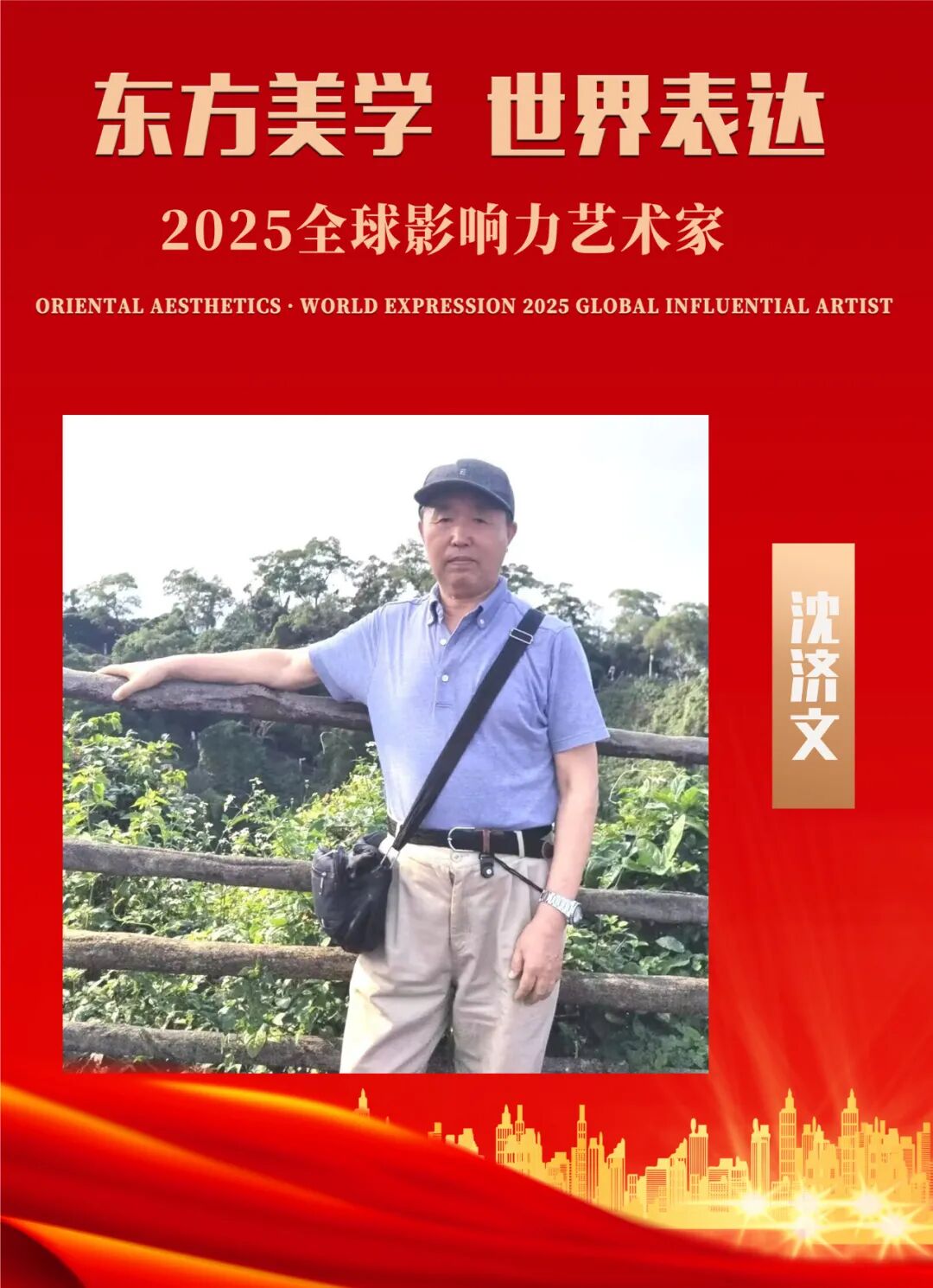 沈济文,北京清华大学客座教授,1950 年生于辽宁省抚顺县,1968 年当兵,1970 年入党,1973 年考入辽宁师范大学。1976 年毕业后在抚顺教育学院、抚顺市委党史研究室和抚顺社会科学院工作,职务是研究员、教授。2010年退休后在家专门研究书法和绘画,创意了“合壁书”书法作品,是合壁书书法创始人,民族艺术家,CCTV(艺术名家)特聘中央电视台艺术导师,并为其设立了中央电视台艺术导师工作室。目前是中国书画研究中心研究员,中国书法研究院名誉院长,九州风林国际书画研究院名誉院长等职。在近十几年创作中参加全国书法大赛三十余次,荣获金奖三十余次。作品先后被中国国家画院、中国国家博物馆、中国文化遗产中心、中国国家艺术研究院等单位收藏。作品先后被许多书画网站发表,荣获“大爱无疆艺术名家”,“建党百年献礼功勋艺术家”。参加全国艺术里的中国,作品发表后被授予“人民艺术家”荣誉称号。2022 年 5 月加入央视书画网,成为签约艺术家,作品还被雅昌网站鉴定备案,成为人们关注的书法艺术家。2022年先后荣获“国礼形象大使”,“中国美育领军人物”,“全国第一批非物质文化遗产创新人才”,“一带一路文化先锋人物”,“中国文化品牌艺术家”,“最具收藏价值艺术家”。另外被聘请为国礼形象大使,文化部为其设立了“中华艺术名家沈济文工作室”。现在合壁书书法作品主要有百寿图、千寿图和万寿图长卷。其中部分作品先后被《全国中老年书画作品集》,《中国当代书画名家精品选》,《2011中国书法美术人物年鉴》,《中国书画典藏》,《中国书画家大典》,《中国首届百名书画家与国际友好使者新春联谊会作品集》,《中国书画名家大辞典》,《全国中老年书画作品北京邀请展精品集》,《“八一杯”中国南昌第8届文学艺术大奖作品集》,《国之瑰宝百年功勋中国中老年书画名家作品选集》,《中国当代书画名家大辞典》,《血铸中华-中国中老年红色书画家作品集》,等40多部书画专辑收入。2022年作品先后被“国际巨匠艺术家”作品集,“中华非遗传承人物年鉴”,“大国艺术”作品集,“走进中国近代大师经典名家名作”,“艺术里的中国 ”,“纪念毛泽东主席诞辰130周年”作品集 ,“奋进新征程建功新时代”作品集,“新中国国礼大师”作品集收入。出版个人专辑“中国书画名家精品系列”——《沈济文作品精选集》,出版个人专辑邮票30多部,并入选中国、美国、荷兰、法国、意大利等5个国家联合出版的邮票个人专辑,许多作品被几十家网站转载和收藏。2025年先后参与出版了《新中国文化大使》和《故宫百年书画经典》。