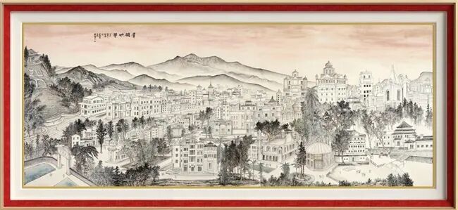 在色彩运用上,范松森打破传统水墨的单色体系,引入西方水彩的透明性与现代丙烯的饱和度。他以朱砂点染惠堂体育场的屋顶,用石青渲染紫金山的植被,在保持水墨基调的同时,使画面呈现出"墨不碍色,色不碍墨"的视觉效果。这种色彩革新在"热矿泥温泉"的描绘中达到巅峰:蒸腾的热气以留白表现,而泉池的矿物质色泽则通过多层罩染形成渐变,传统美学与现代科学在色彩语言中实现对话。