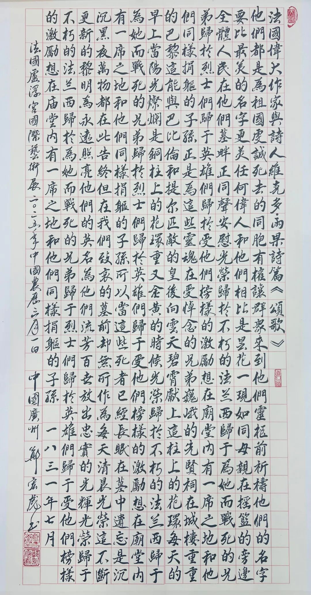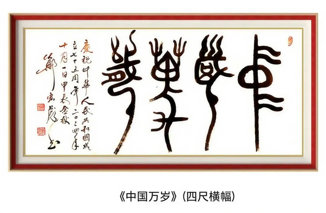外展书法——近年,他用中国的书法艺术表达外国的文学艺术作品,在国外展出一批“中外牵手”的书法作品。2025年1月,他书写的泰国《颂圣歌》(行书•四尺条幅)在中泰建交50周年书画展上展出;2025年2月,他书写的但丁《神曲•天堂篇•第一首•登天》四尺行楷条幅,在“遇见中国”意大利中国文化展中展出;2025年4月4月4日至7日,他将法国作家、诗人雨果的诗歌名作《颂歌》书成四尺行楷条幅,在世界顶级艺术殿堂卢浮宫展出。另外,他曾书写哈佛大学校训,加州大学校训赠予这两所学校;书写牛津校友、著名诗人雪莱的长诗《西风颂》大楷长卷赠予牛津大学,等等。