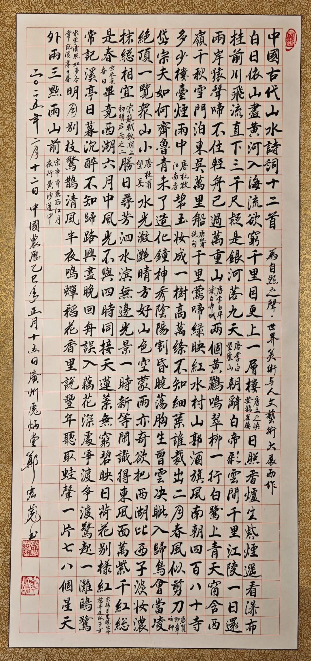 澳大利亚展出并获奖的行楷《中国古代山水诗词十二首》,则回归传统帖学正脉,展现郑宏彪深厚的碑帖修养与书写定力。全篇字体规整而不板滞,点画间透出从容与沉稳,显示出他在继承魏晋风骨和唐人法度方面的深厚功夫。尤其在“山”“水”等字上,笔法干净利落,结构匀称和谐,于静中见动,在工整中求变。这种对传统的坚守并非泥古,而是以当代视角重新激活历史记忆,赋予古老文字以新的生命力。
