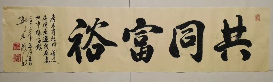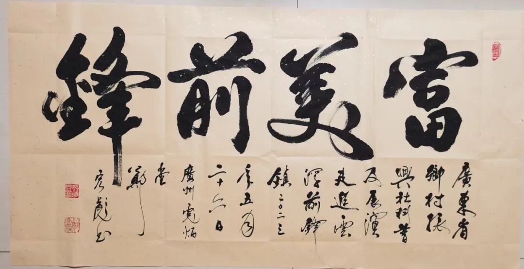 小康书法—— 2020年与2023年,分别参加广东省脱贫小康展演与乡村振兴展演,带领村干部与村民朗诵他的原创朗诵诗《2020中国小康》、《二十大,一个政党向着人民庄严宣誓》、《共同富裕》,并在展演舞台上为村民书写赠送“脱贫小康书法”、“乡村振兴书法”3000多幅。