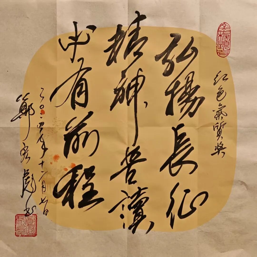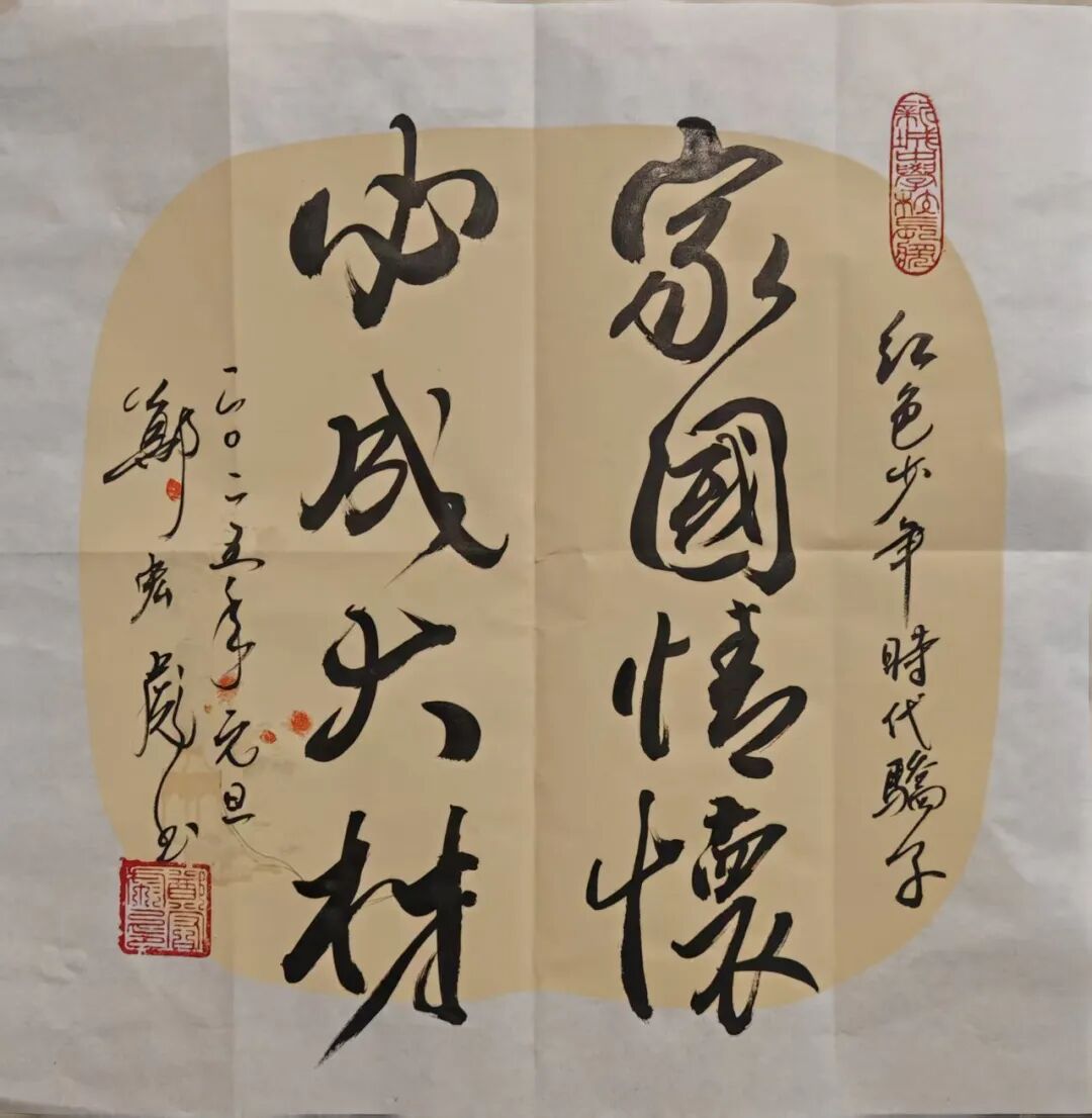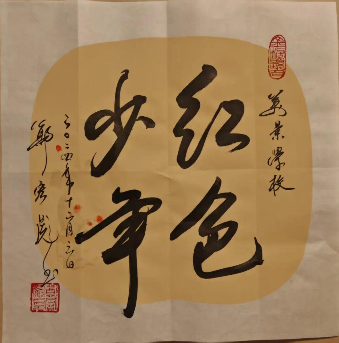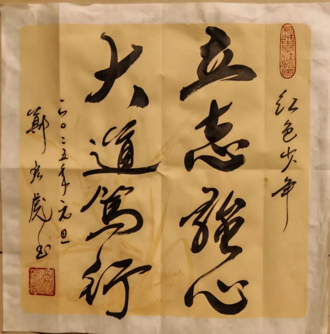 励志书法——在校园、部队、企业的千场演讲中,为大中小学生、军地青年书赠“励志书法”共3万多幅。如为江苏盐城母校给“小校友”书赠励志书法660幅;为汕尾市新城中学书赠励志书法2000多幅,其红色励志书法作品分别成为汕尾市新城中学“校长奖”(毎学期100幅)、佛山市狮山实验学校“红色气质奖”(毎学期200幅)、清远市清城中学“红色传承,贤美之星”奖(每月45幅)、“少年讲书人”获奖者的专属奖品(每届300幅)。