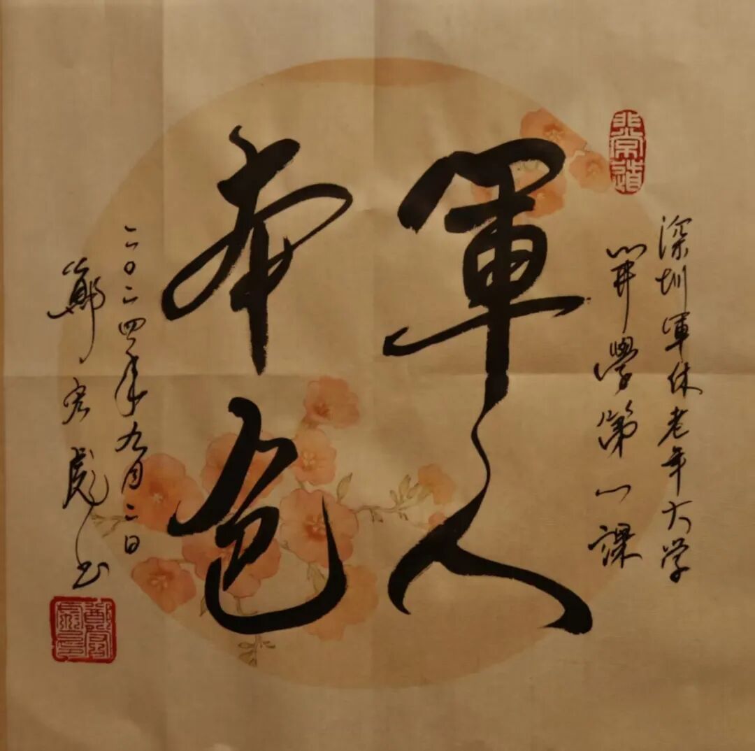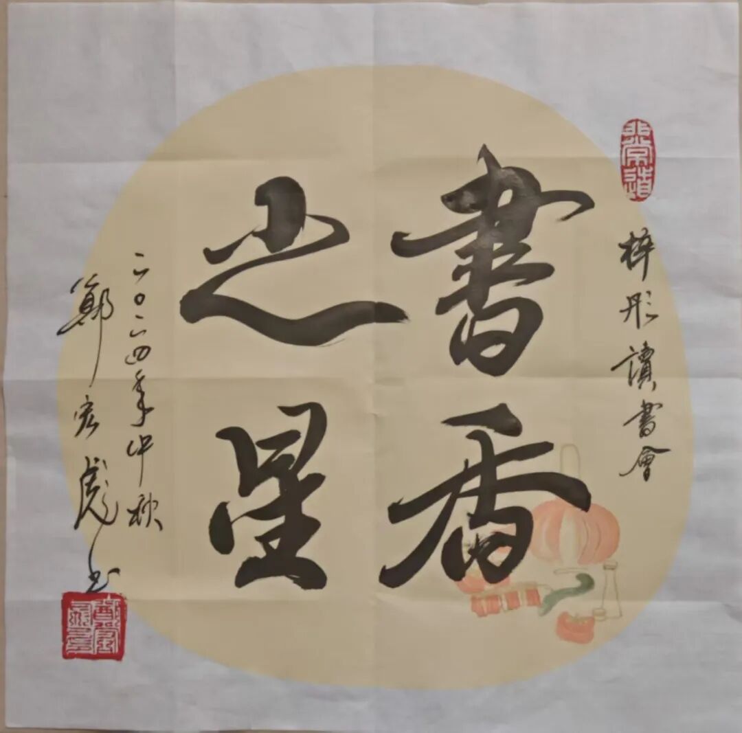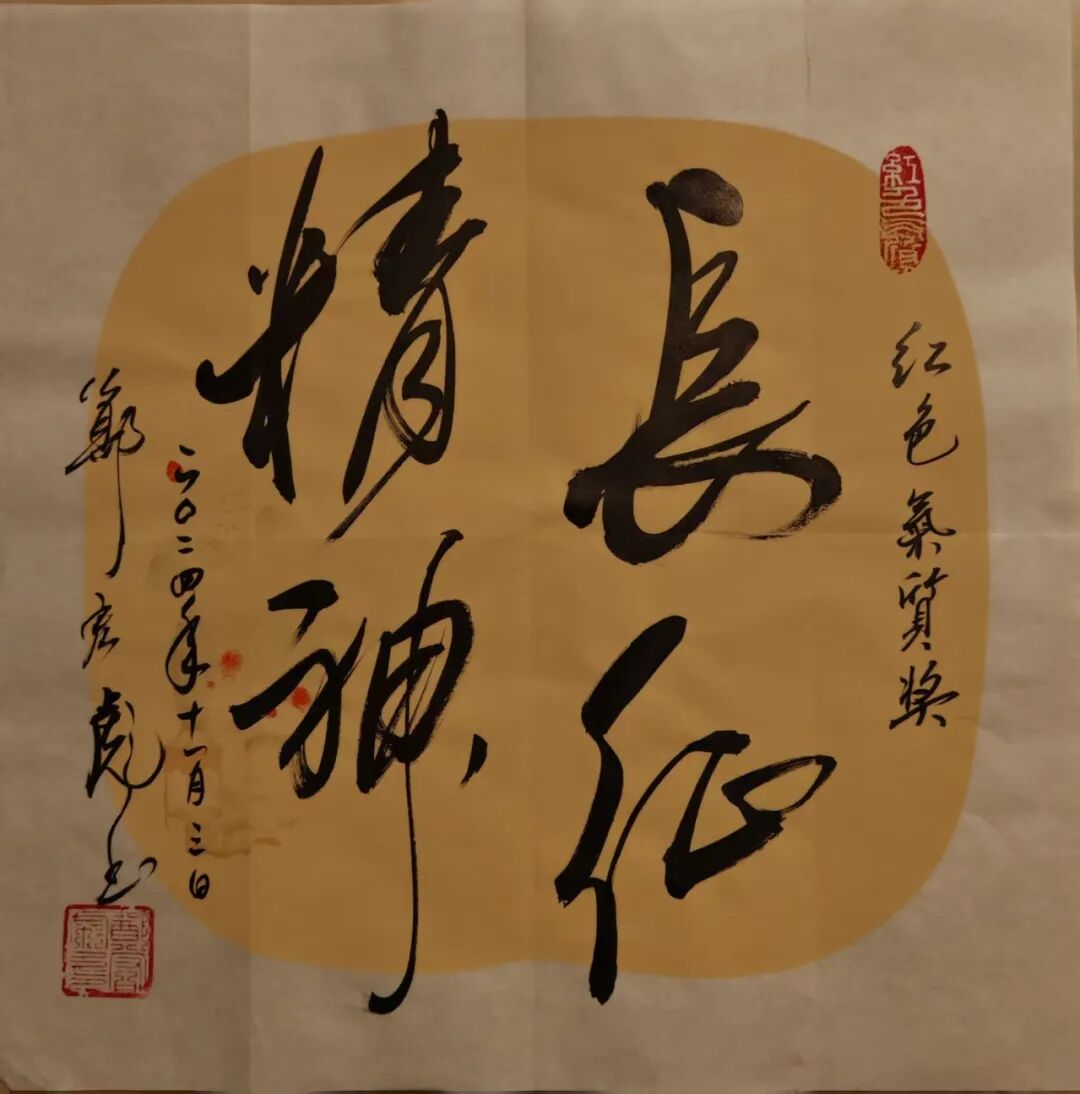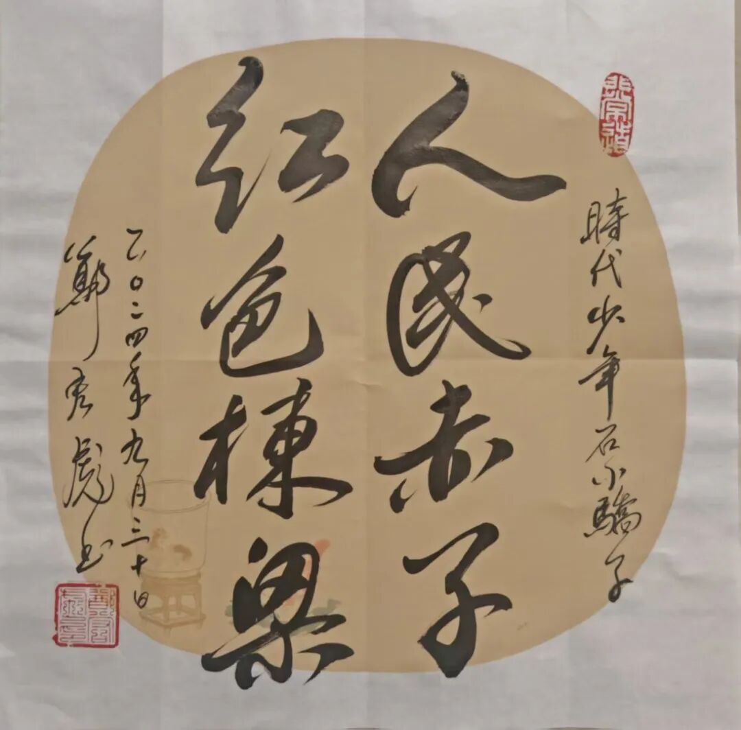励志书法——在校园、部队、企业的千场演讲中,为大中小学生、军地青年书赠“励志书法”共3万多幅。如为江苏盐城母校给“小校友”书赠励志书法660幅;为汕尾市新城中学书赠励志书法2000多幅,其红色励志书法作品分别成为汕尾市新城中学“校长奖”(毎学期100幅)、佛山市狮山实验学校“红色气质奖”(毎学期200幅)、清远市清城中学“红色传承,贤美之星”奖(每月45幅)、“少年讲书人”获奖者的专属奖品(每届300幅)。