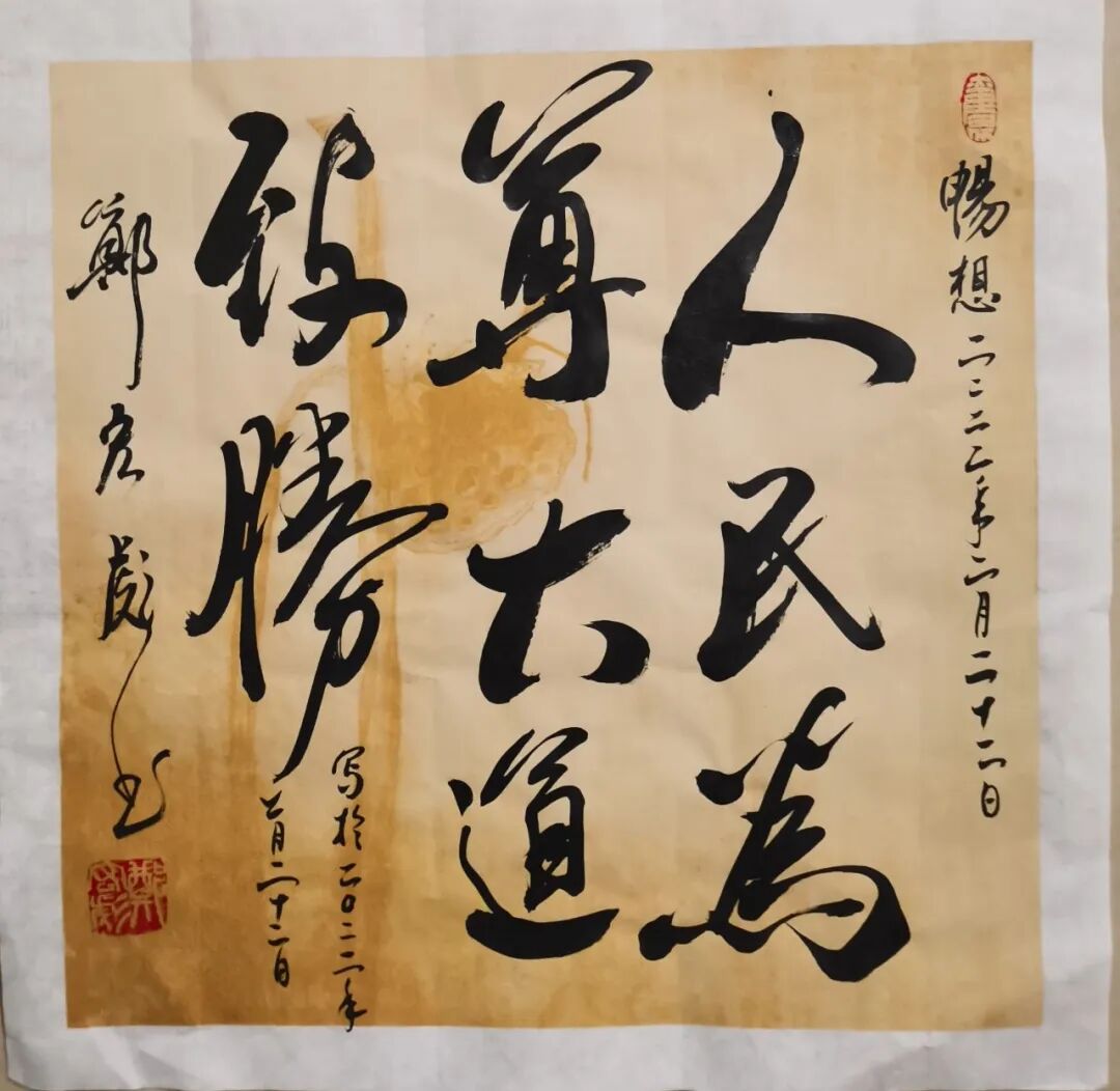 他将强烈的“人民文艺观”贯穿于自己的文艺创作之中。倡导“把诗歌从诗人的小圈子里解放出来”,创作的“红色朗诵诗”独树一帜;他推崇健康向上的书法艺术观,反对单纯在书法界的小圈子里玩书法、玩展览、玩丑书,追求书法为人民大众服务。因此,他书写赠送给青少年的“红色励志书法”超过3万件,还有一大批“党建书法”、“脱贫小康书法”、“贺春书法”、“校训书法”、“嵌名书法”、“外交书法”等。