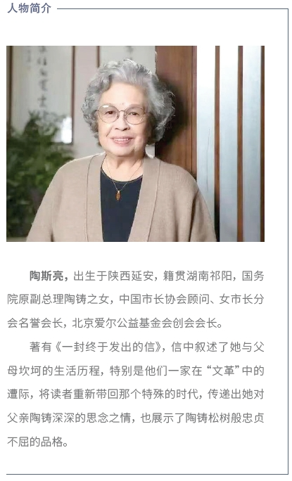 看着亮亮姐的背影渐渐融进金黄色的傍晚时光,不由得感慨她这80余年的经历何其丰实、多彩:穿过战争的硝烟、经受劫难的摧残、变换不同的职业、参与国家的变革……也就不难从中悟出:她的身上,传承了湖南籍父母直率血性、为信仰而战的基因,形成了陪伴她童年的杨叔叔那忠诚善良、温顺宽厚的品质,流淌着革命军人百折不挠、坚韧向上的血液,因而融会成如今平和中藏着睿智、笑容里发散温暖的陶斯亮……