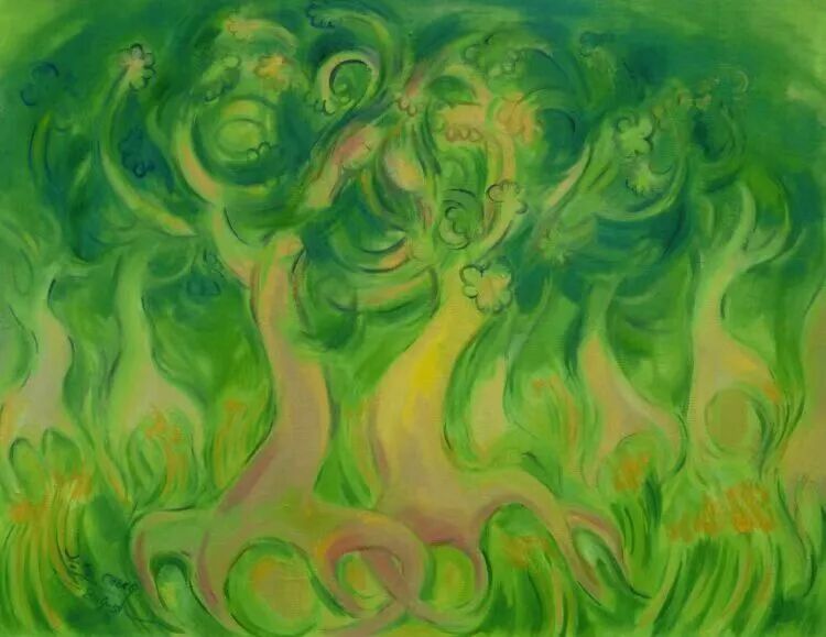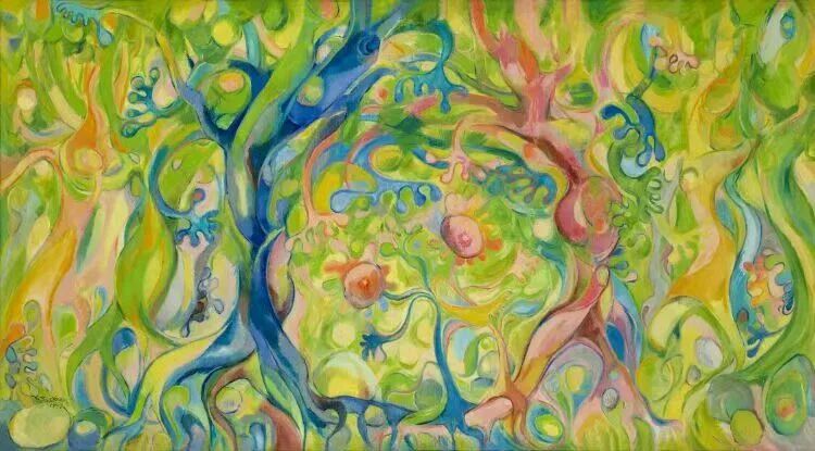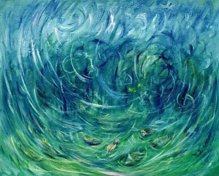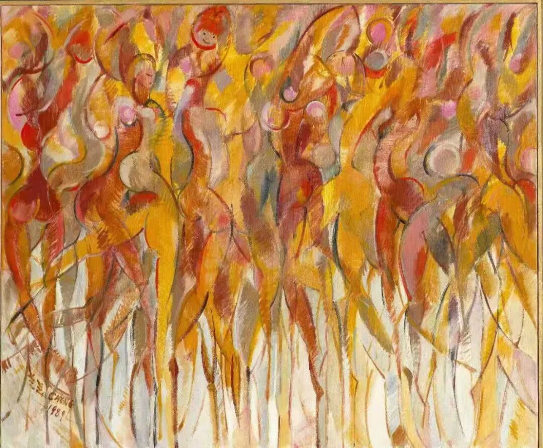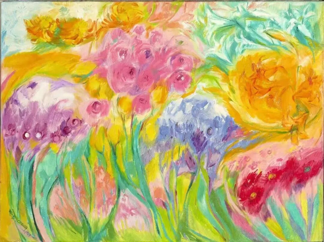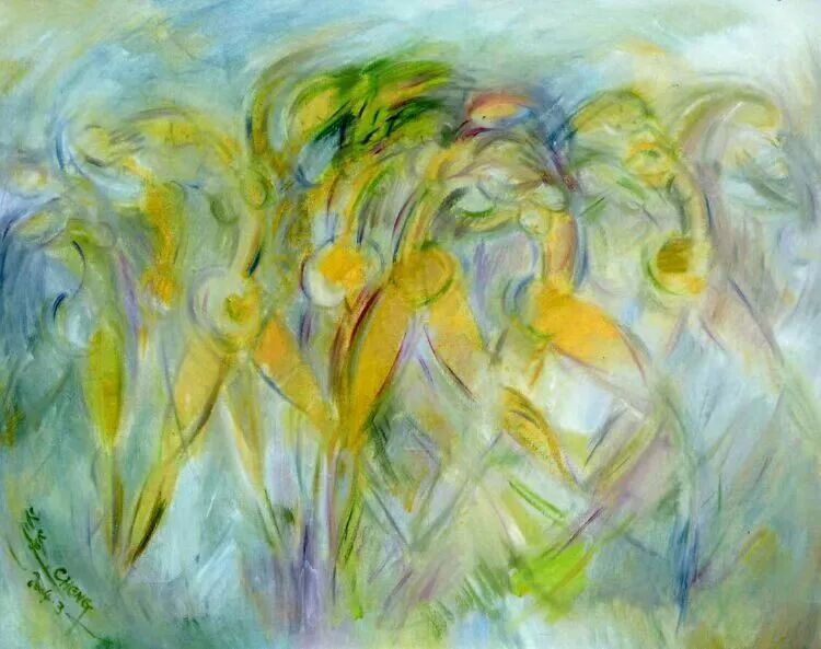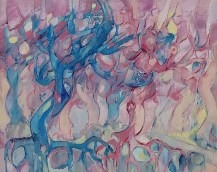 欣赏郑兰美女士的画作,最引人注目的就是她对色彩的精妙把控。或许有人认为这是抽象派的影子,但在我看来,这完全就是郑兰美女士心中情态的外化体现。浮动如烟的身姿色彩,如梦如幻,如痴如醉,同时又能在富有节奏的笔触变化中,使画面形成一定的视觉张力,并由此升华为一种充满"爱"的审美境界。而在这个境界里,是跃动着郑兰美女士的精神与灵魂。将女性独有的感性特质完美融入画作之中,既不流于俗套,又平添了几分神性光辉。因此她的这些作品,既是能成为一面映照心灵的艺术明镜,同时也更是她对女性美这一永恒主题的深情礼赞。