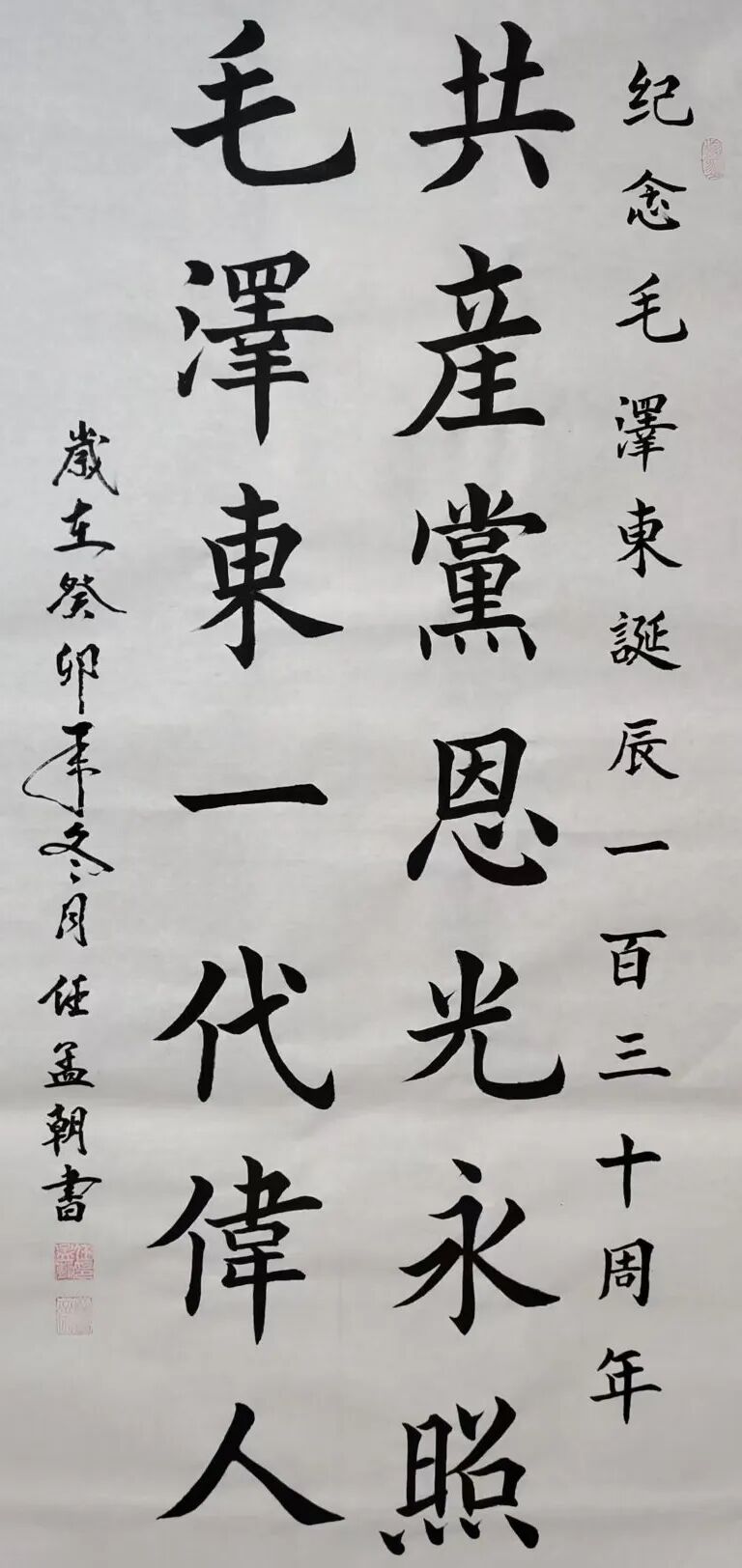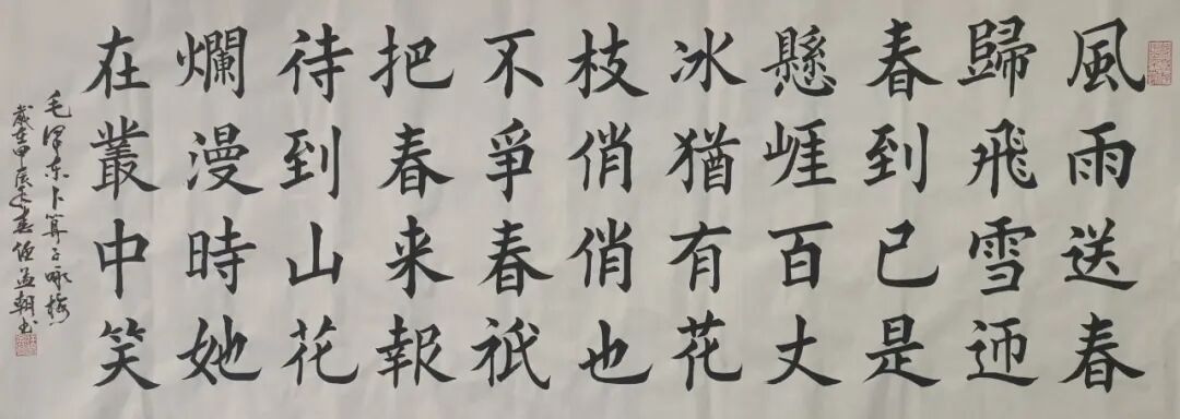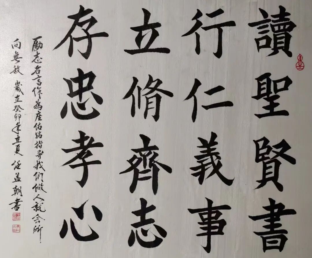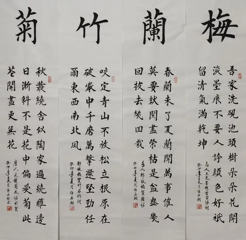 任孟朝五体皆精,真草隶篆行样样精通。楷书融合颜真卿的雄浑、王羲之的飘逸和欧阳询的严谨,如泰山般巍峨;行草取法孙过庭等历代宗师,似行云流水,刚柔相济、气韵生动;隶书独具特色,“飞白”笔墨如老梅着花,苍劲中显风骨,古拙中见灵韵。