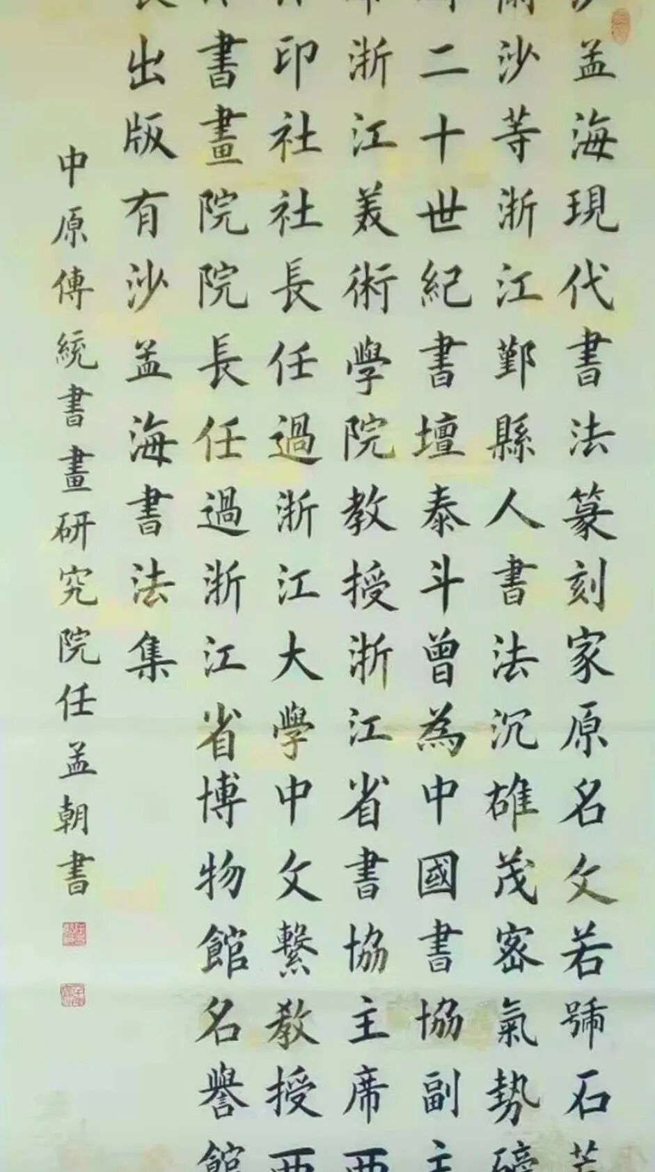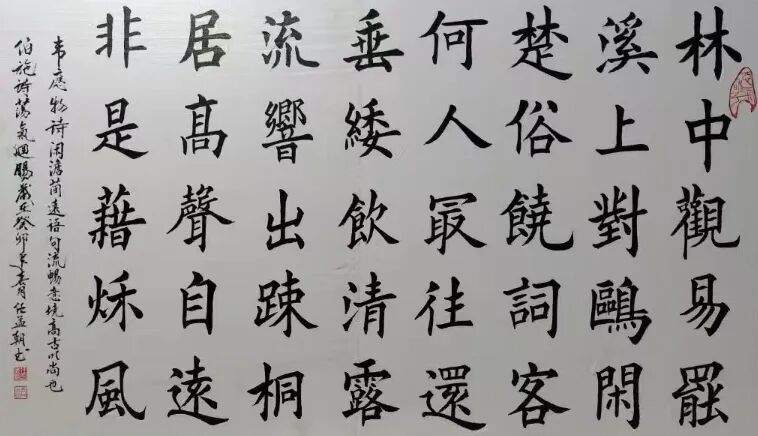 古人云,学书易少年时将楷书写定,始是第一层手。此为千古不变之真理。今看任孟朝先生翰墨成就,亦是可见其楷法之功深,笔墨之雅正!且纵观当今书坛,能像任孟朝先生这般既写楷之形神,又写楷之气概的书法家,也是着实不多见。其楷法以欧楷风骨其底蕴,又能兼取颜鲁公之气魄、王逸少之秀润,实是一字一笔皆从古贴中来,取法正宗,不落蹊径!字字楷书,用笔极尽沉稳,取势更是以雅正为美,正所谓骨丰肉润,入妙通灵,一幅中,真如君子之仪,结字成章,贵乎沉静也!