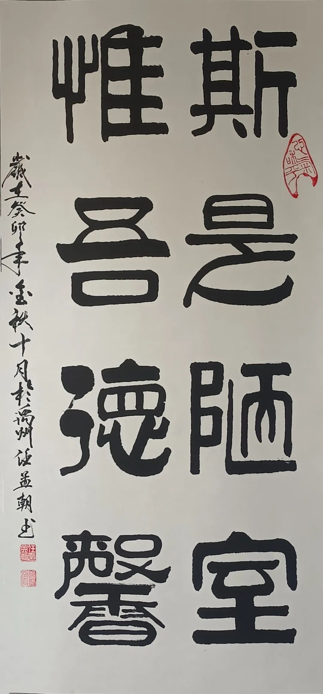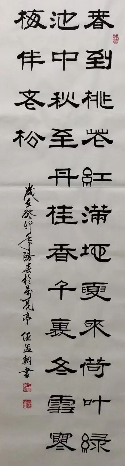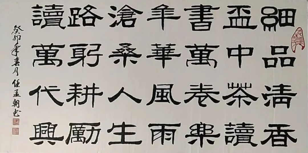 又有隶书众幅,可以写尽碑法之雄壮,笔笔线条敦厚无媚,大有一笔不可偷苛,肉浮血露,势伟气壮之概!求索问道不遗余力,人书倶老大家风范,不得不说,作为一名深具文人胸襟的书法家,任孟朝先生是真正扛起了当代书法的弘道重任,继往圣之绝学,树翰墨之勋遒,又积极投身公益事业,致力于培育新一代书法英才。作为后辈,惟余敬仰之情溢于言表,更衷心祝愿任孟朝先生身心康泰,艺树常青!