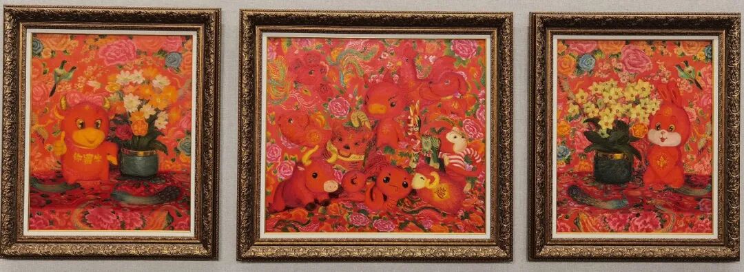 《中国吉祥组画》左:《牛年吉祥》80cmx65cm;中:《年年吉祥》80cmx90cm;右:《兔年吉祥》80cmx65cm 油画。2023年 洪瑞生