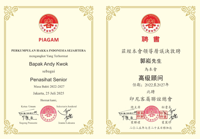 据悉,为进一步汇聚侨智侨力,提升服务印尼市场的专业性与影响力,印尼客属联谊总会近日特别聘请广东省对印尼贸易促进会会长郭崧为高级顾问。双方相信此举将更好为广东企业牵线搭桥,深度融入印尼当地社会、精准把握市场机遇、有效服务粤企提供强大的智力支持与资源保障,为粤印尼经贸合作注入新的活力与动能。