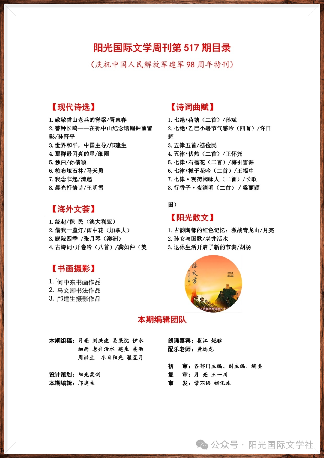 热烈祝贺阳光国际文学周刊发刊第517期
