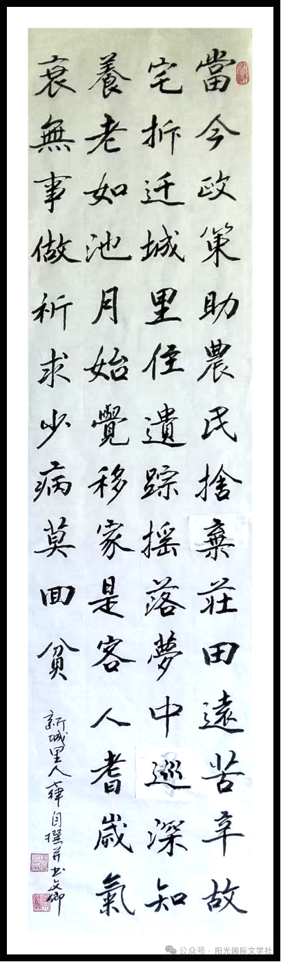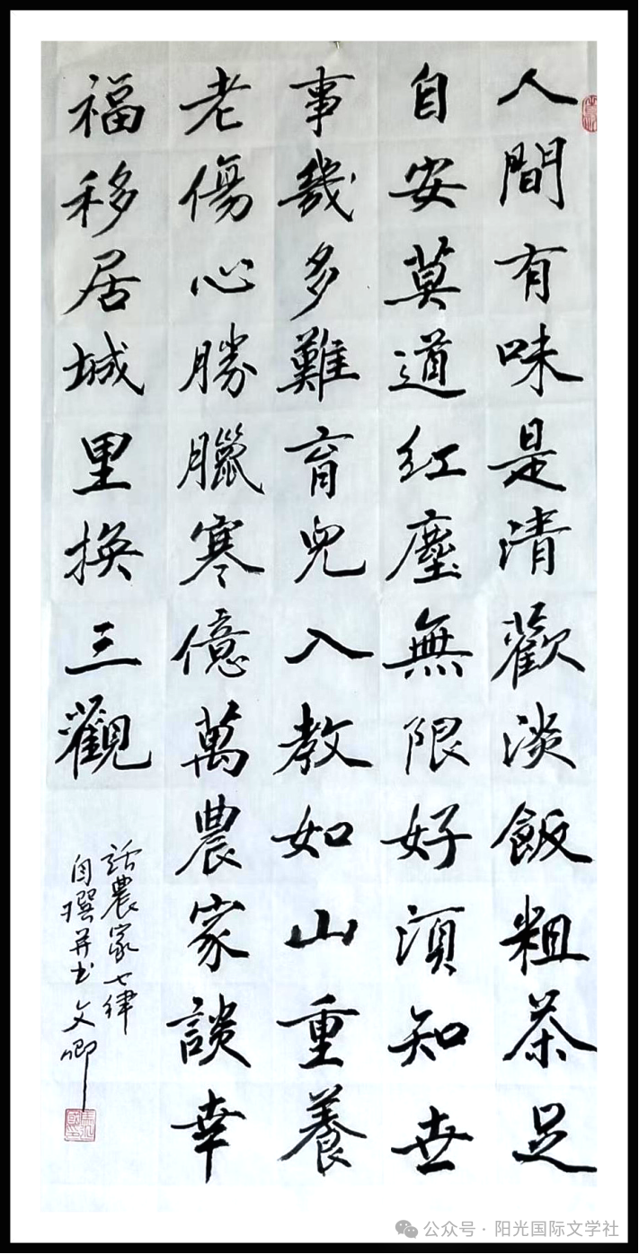 文卿,姓名:马延国,1952年出生,山东滕州人。自幼喜好文学,更爱书法,笔耕不辍。人近夕阳下,不负韶华时,进入蓝星公益诗院学习诗词创作。书法诗词均在今日头条,视频号等许多家个媒体中发表。诗词在2023年度“华夏杯”荣获成绩优秀奖。