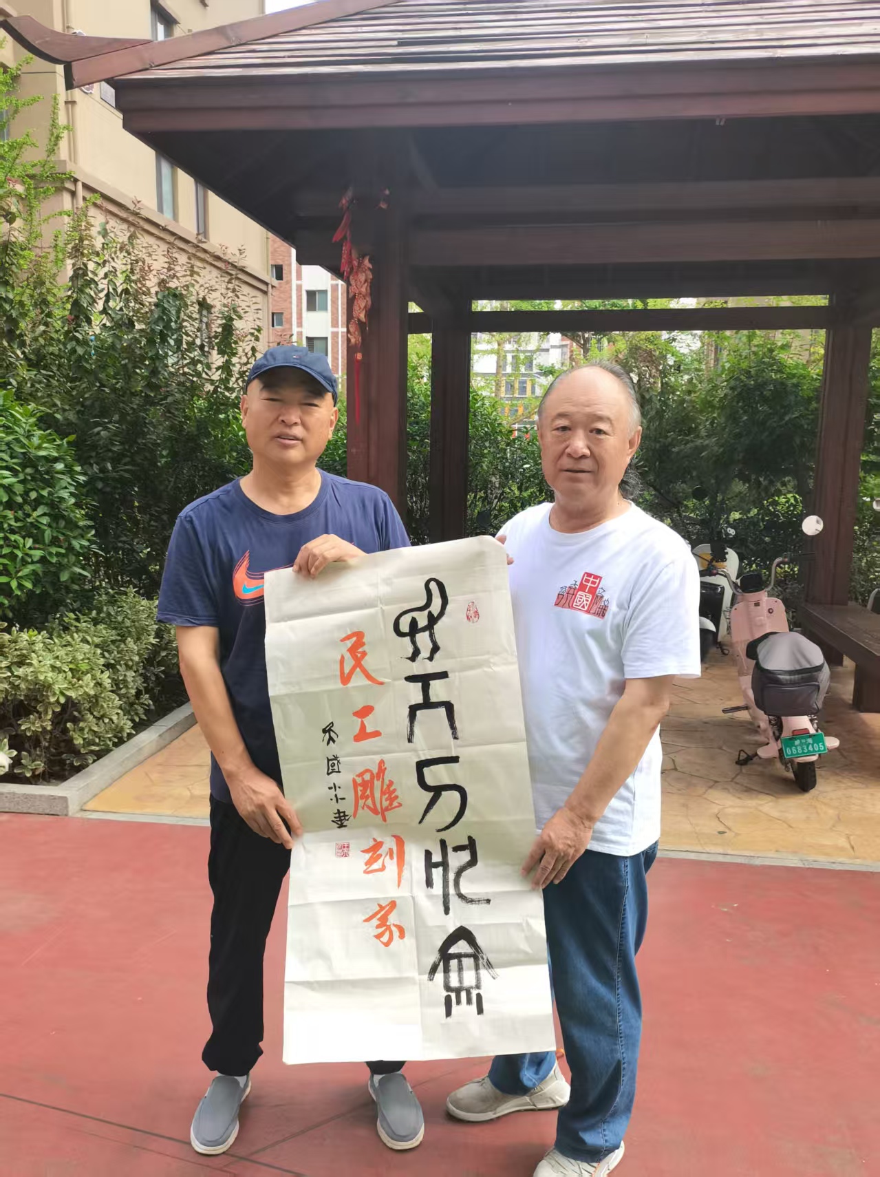 图1、雕塑家谷涛与书法家王天国合影
