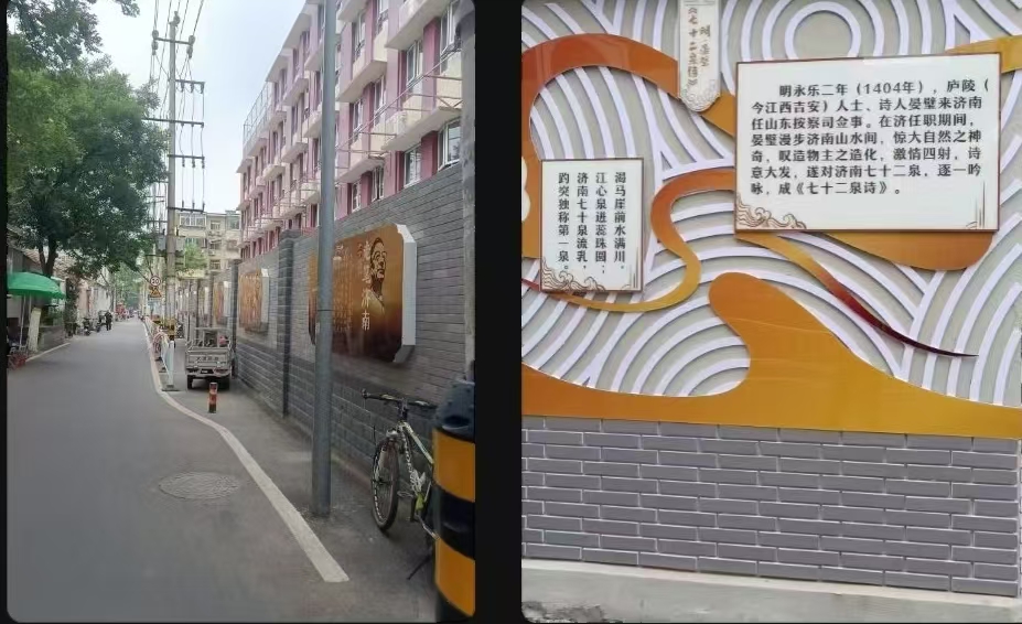 趵突泉办事处和居委会在趵突泉公园南门对面的南新街西墙面,做了介绍七十二名泉的宣传展示版面,在老舍旧居北边,趵突泉小学西墙外,做了老舍文摘的展板,片区管理部门努力打造在家门口就能了解自己街巷文化和“名泉秀水”的自然氛围,期望能看到更多的南新街故事,让历史文化承传发展。
