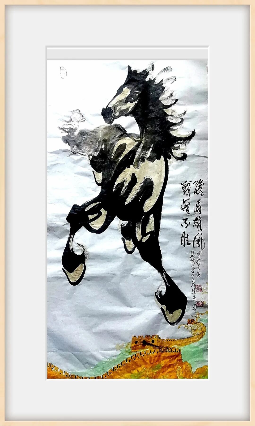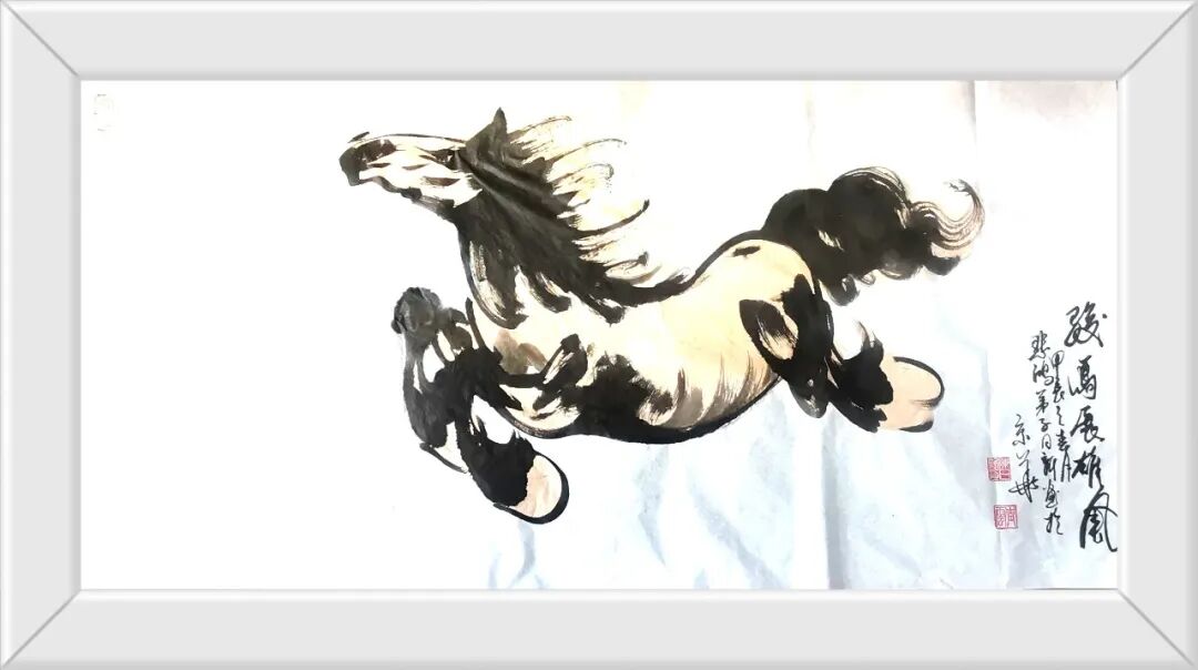陈日新先生承袭悲鸿画马的精髓,但并未止步于模仿。他深入研习传统工笔与写意的交融之法,又吸收西画对光影、动态的捕捉技巧,最终形成“形神兼备、动感卓绝”的个人风格。观其作品,笔下骏马或昂首嘶鸣、鬃毛飞扬,或奋蹄疾驰、踏破烟尘,线条如铁线盘丝却不失灵动,墨色浓淡相宜更显层次——马的骨骼肌理隐于笔墨之下,奔腾之势跃然宣纸之上,仿佛下一秒便要冲破画框,裹挟着风与力量扑面而来。这种对“动感”的极致诠释,恰如徐悲鸿夫人廖静文女士的评价:“画的动感好”,寥寥数字,道尽其作品最鲜明的艺术特质。