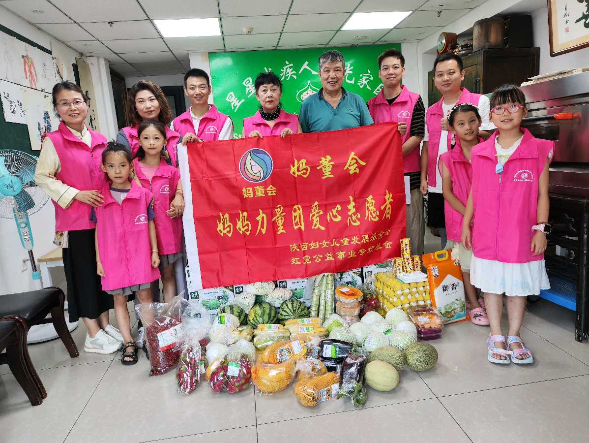 陕西妇女儿童发展基金会虹霓公益事业专项基金妈妈力量团副团长张治莲携手陕西格颜美诺科技生物有限公司董事长谭特、西安秦瑞泰信息技术服务有限公司代表郭飞经理,志愿者、谭博、张晨、刘镇及四位小志愿者郭思萌、马悦雯、朱笑影、谭蕊曦一同走进福利院,用爱心物资与真诚陪伴,为这里的孩子们送去夏日里的清凉与温暖。