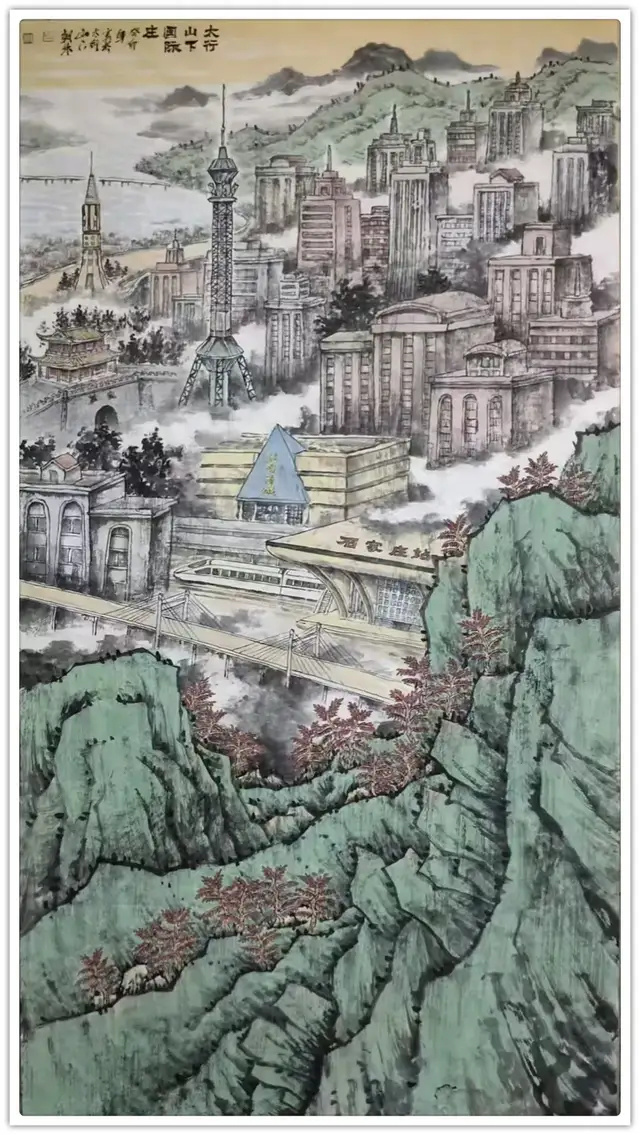 其"新青绿"系列弱减了传统仙山意象,转而表现太行山系真实地质肌理,矿物颜料与当地岩层的物质同构性,暗含"山水即本体"的生态观。