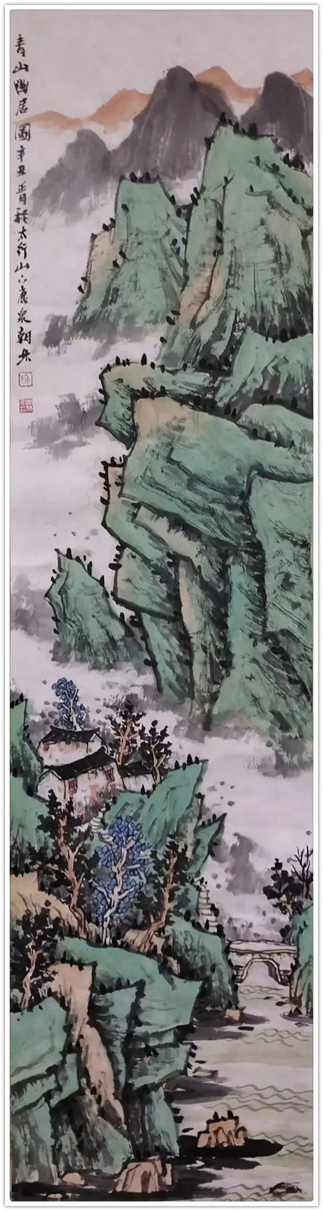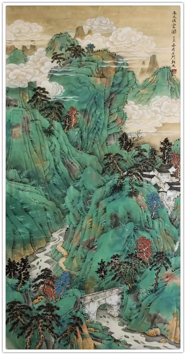 区别于传统青绿山水"勾线填色"的程式化处理,其笔法融合小写意皴擦(如《溪山新雨》中的豆瓣皴变体),使青绿设色与水墨肌理形成张力,解决了重彩易板结的难题。