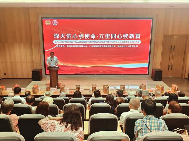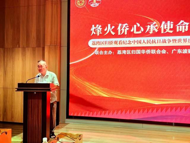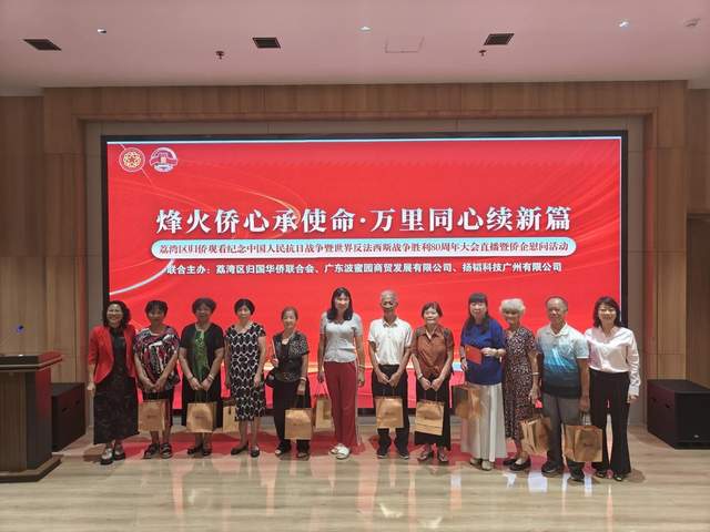 2025年9月3日上午,为纪念中国人民抗日战争暨世界反法西斯战争胜利80周年,弘扬伟大抗战精神与爱国主义精神,广州市荔湾区侨联联合广东波蜜园商贸发展有限公司(以下简称波蜜园公司)、扬韬科技广州有限公司,在1906科技园礼堂,共同举办“烽火侨心承使命 万里同心续新篇——荔湾区归侨观看纪念中国人民抗日战争暨世界反法西斯战争胜利 80 周年大会直播暨侨企慰问活动”。荔湾区老归侨代表、基层侨联工作骨干、扬韬公司员工代表共 100多人齐聚一堂,在庄重热烈的氛围中铭记历史、缅怀先烈,珍爱和平、开创未来。