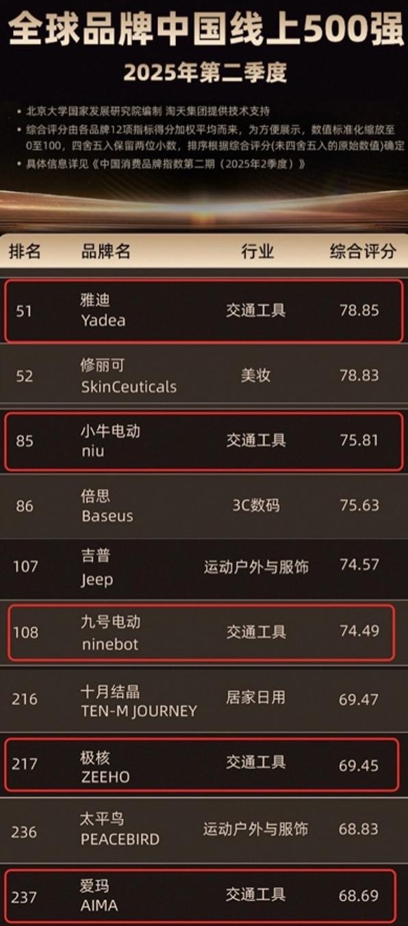 近期,由北京大学国家发展研究院编制,阿里巴巴淘天集团提供技术支持的2025年二季度“全球品牌中国线上500强(CBI500)”榜单发布。国产电动两轮车品牌纷纷上榜,雅迪和小牛电动更是冲进TOP 100,在国补等政策红利推动下,小电驴增长一路狂飙。