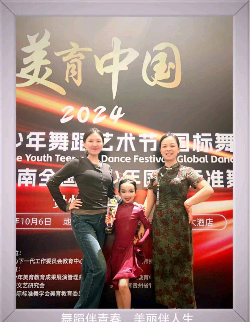 这句话像一把温柔的钥匙,瞬间打开了我记忆的闸门。我想起了无数个周末的下午,在凯里国贸大厦四楼舞苑那充满活力的舞蹈教室里。窗外,有时是盛夏灼热的阳光炙烤着玻璃幕墙,有时是如今天这般,暴雨倾盆,豆大的雨点狠狠砸在玻璃上,发出噼里啪啦的声响,模糊了窗外的世界。我们母女俩,一个认真地跳,一个专注地看,或者,在老师指导的间隙,我会走到她门边,看着镜子,一点点帮她纠正手臂的弧度、腰部的力量、脚步的落点。她的发梢因为剧烈的运动而滴着汗珠,顺着脸颊滑落,滴在地板上,晕开一小片湿痕。而我的衬衫,也早已被同样的汗水湿透,紧紧贴在背上,勾勒出尴尬的曲线,汗水沿着脊椎蜿蜒而下,在衬衫上洇出深浅不一的水痕,宛如两条在背部平行流淌的小溪。那些被汗水反复浸泡的周末,那些交织着疲惫、鼓励、偶尔的沮丧与更多的坚持的日日夜夜,最终,都凝结成了此刻奖杯上那道流动而璀璨的光影,闪耀着属于我们共同的荣耀。