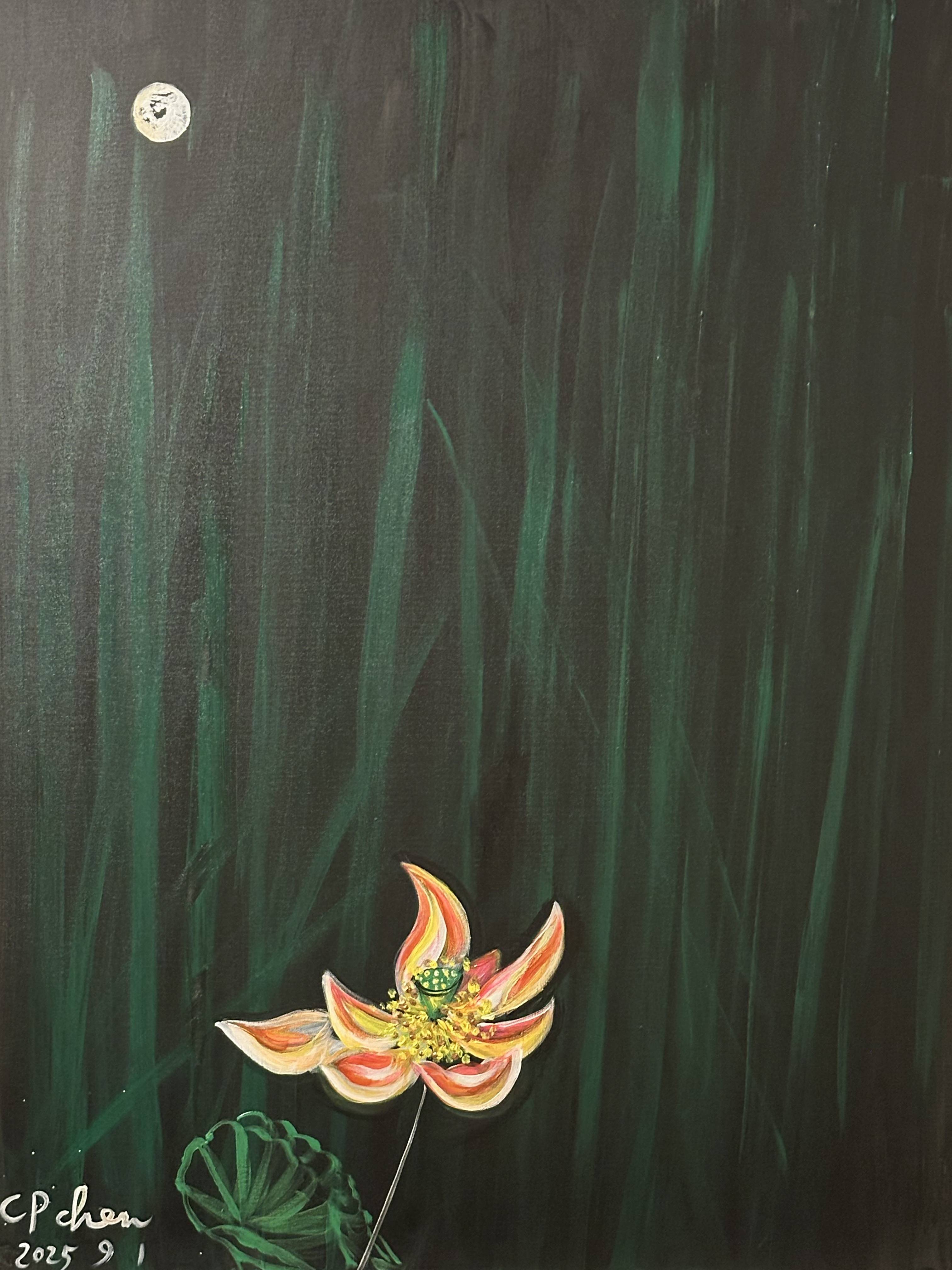 陈持平教授的这幅画作,以月夜下的荷花为核心意象,构建出一个充满诗意与哲思的空间,作品中,深沉的夜色如幕,那轮明月悬于天际,似是时间的守望者,清辉洒落,为整个场景晕染出静谧而又带着些许神秘的氛围。大片的墨绿茎叶,像是时光长河里的层层涟漪,或是通往未来的朦胧路径,它们肆意伸展,既有着生命的蓬勃张力,又仿佛在悄然诉说着岁月的悠长与未知。