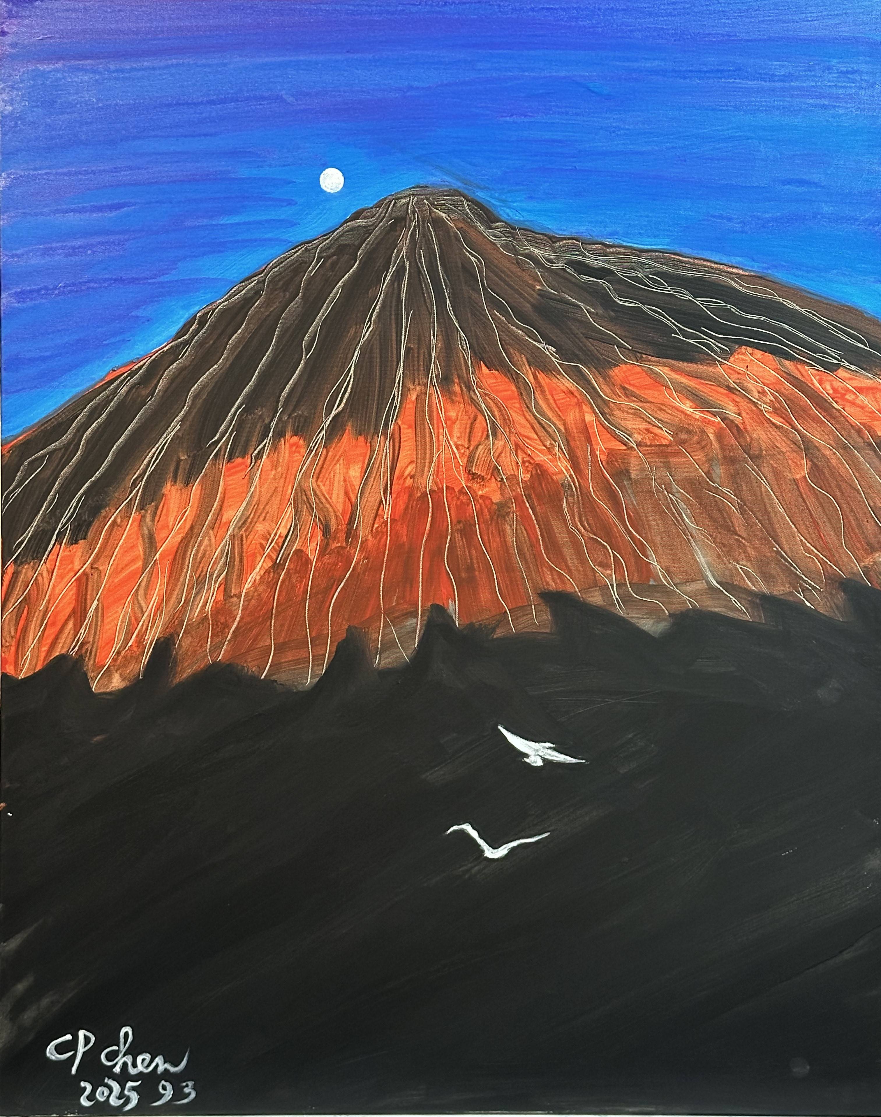 陈持平教授的作品《比翼齐飞》,以极具张力的色彩与构图,构建出一场震撼心灵的视觉与精神盛宴。作品中,那座山峦是绝对的视觉核心。上部深沉的色调似是岁月沉淀的厚重,中部热烈的橙红则如生命喷薄的激情,色彩的碰撞与过渡,仿佛在诉说大地亿万年的沧桑与活力。山顶之上,一轮明月高悬,为雄浑的山景添上了一抹静谧与清冷,在动与静、热烈与幽寂间,达成奇妙的平衡。