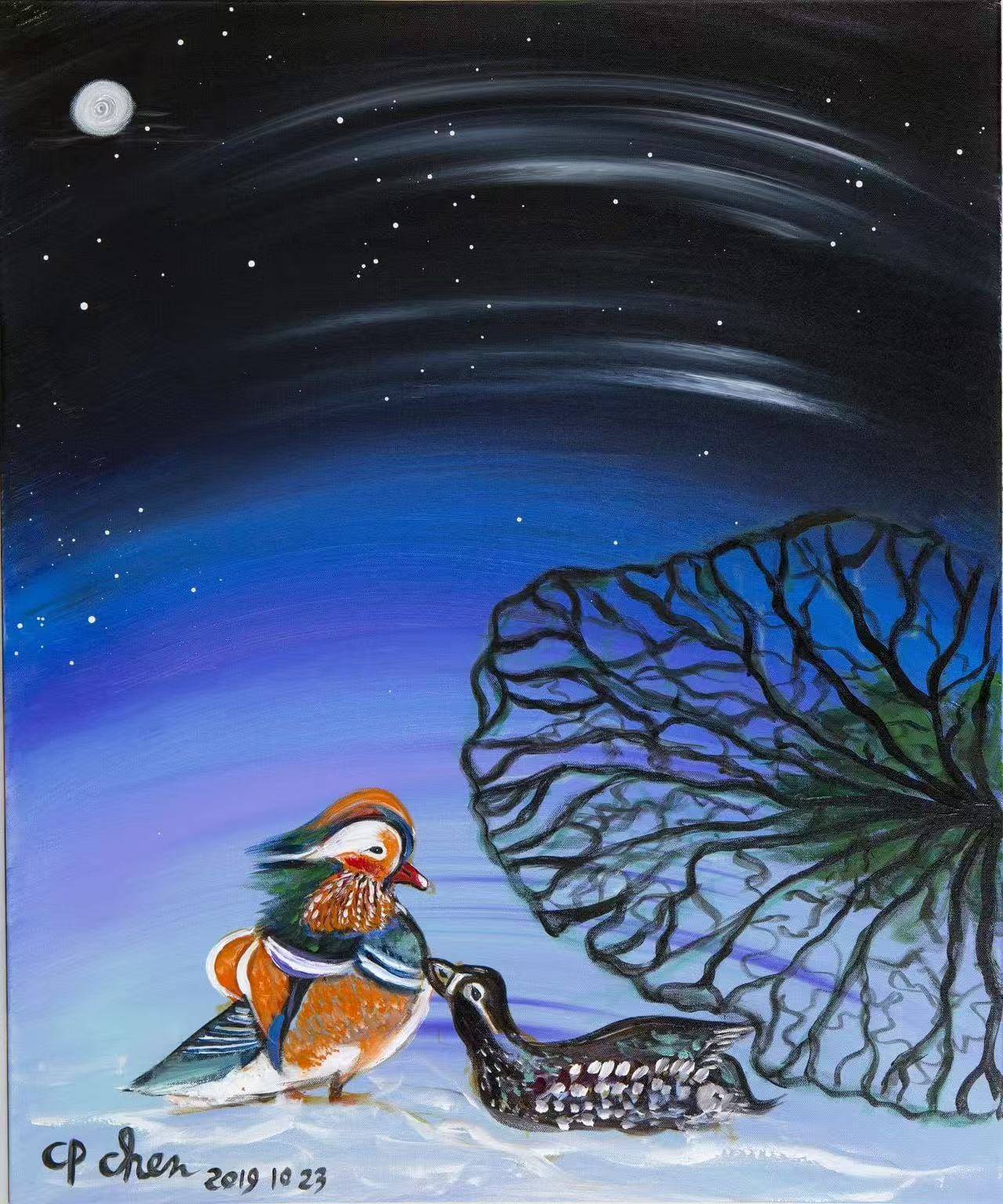 绘画作品同样精彩绝伦。有的描绘出静谧的月夜,星光点点,鸳鸯在残荷旁相依,色彩柔和,营造出温馨又略带忧伤的氛围,与苏曼殊诗句的意境完美契合;有的以泼墨般的色彩,展现出如宇宙星云般的奇幻景象,色彩碰撞间,充满了抽象的艺术张力,给人以无限的想象空间;还有的刻画了雪山、红桥等景致,色彩对比鲜明,或雄浑壮阔,或充满生活气息,每一幅都像是在讲述一个独特的故事,让我们看到陈持平教授对自然、对生活、对艺术的独特感悟与表达。