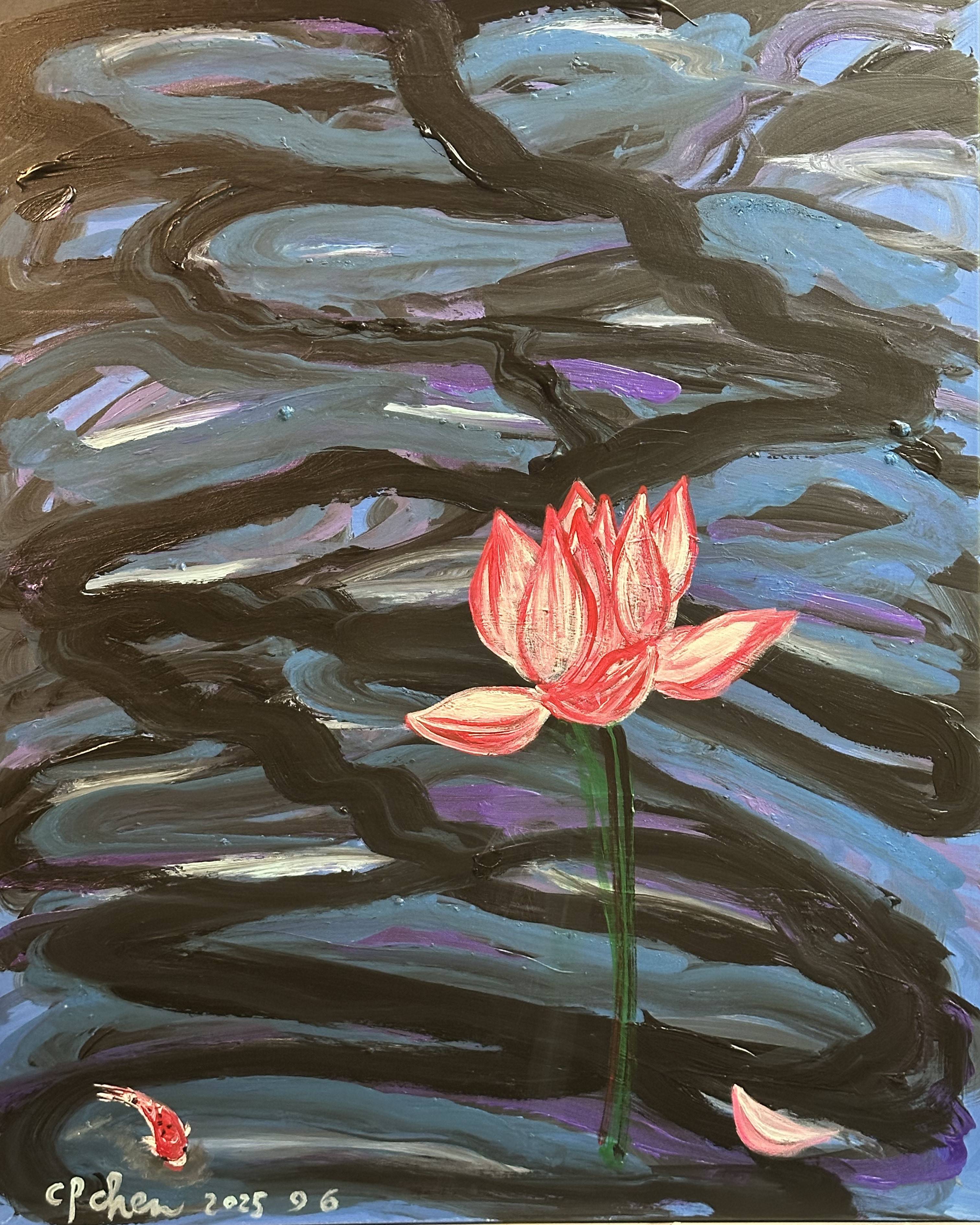 在陈持平教授的这幅画作里,一朵荷花是绝对的视觉焦点。那娇艳的红色花瓣,似燃烧的火焰,热烈又夺目,花瓣的纹理与色泽,细致地展现出荷花盛放时的蓬勃生机,仿佛能让人嗅到那清新的荷香。