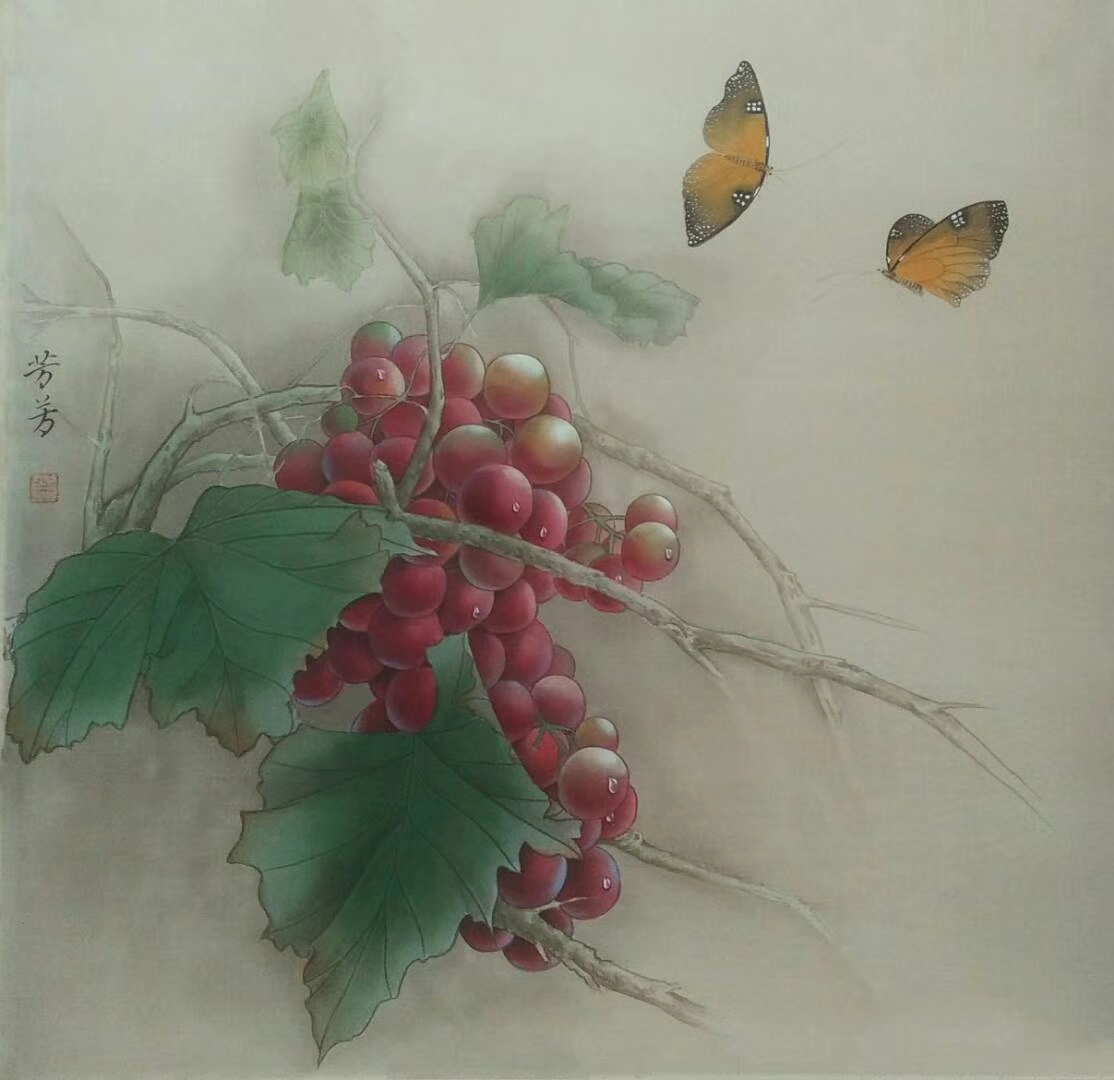 观《葡萄蝴蝶图》,则见葡萄垂珠如“紫玉”,蝴蝶振翅似“流霞”,红与绿的碰撞如“万紫千红总是春”的绚烂,又似“小荷才露尖尖角”的清新,笔触间既有“铁画银钩”的刚劲,又含“行云流水”的柔畅,恰似“笔落惊风雨”的豪情与“润物细无声”的细腻共舞。