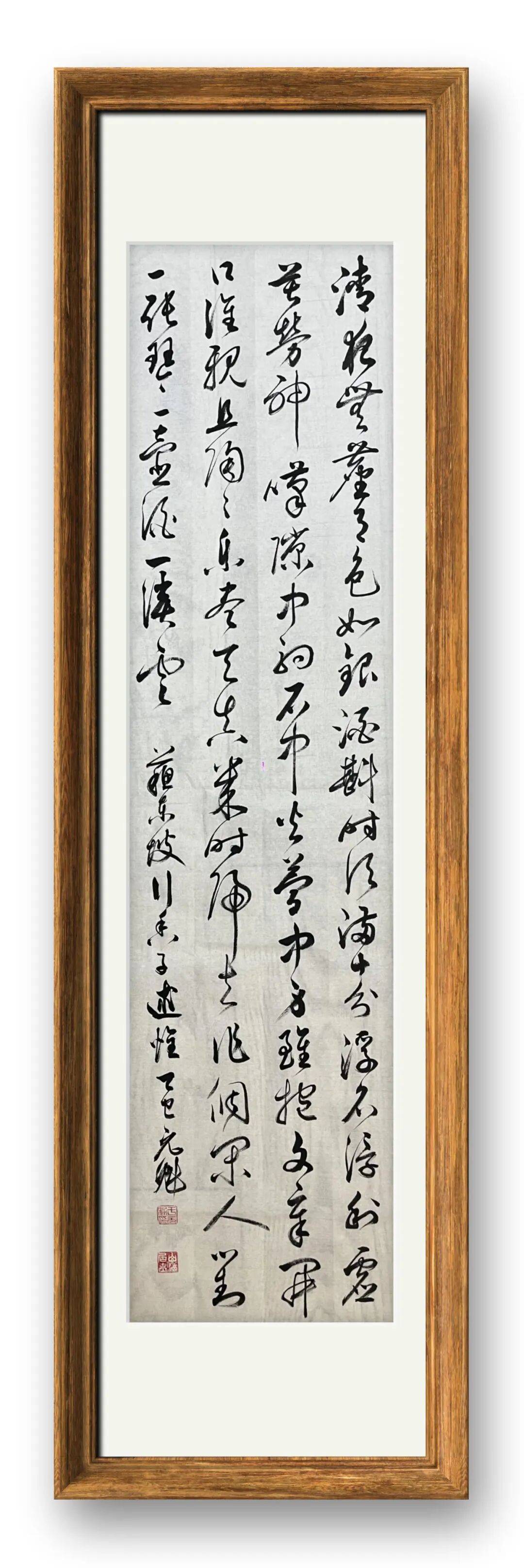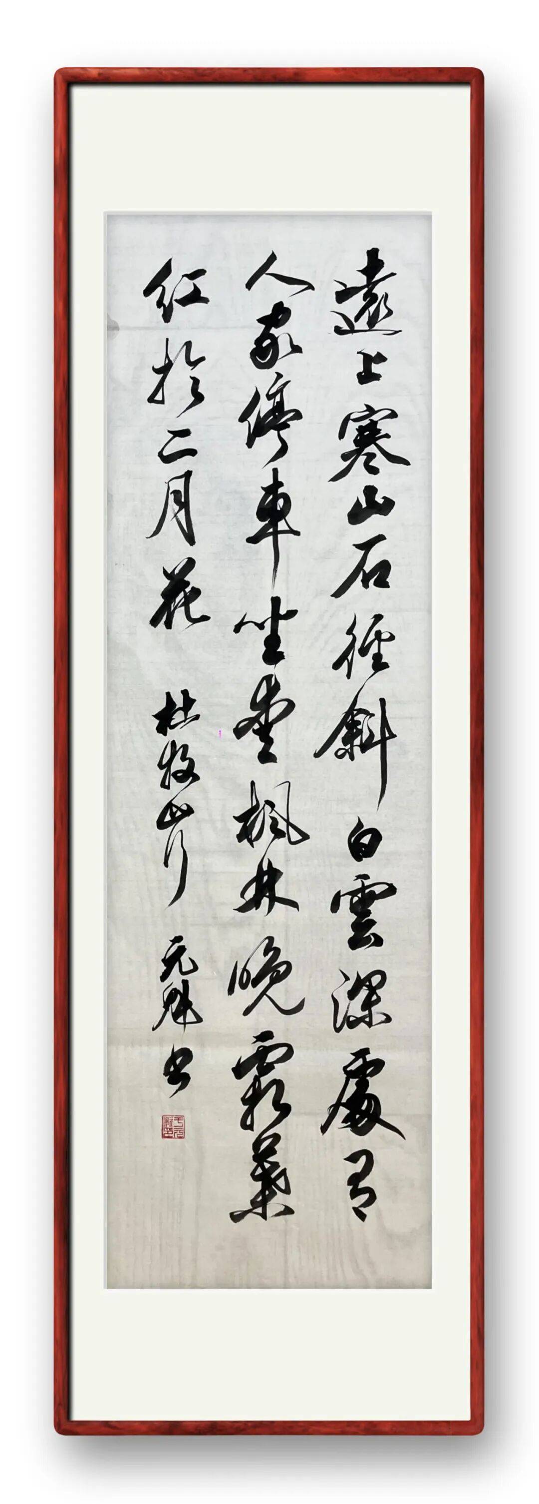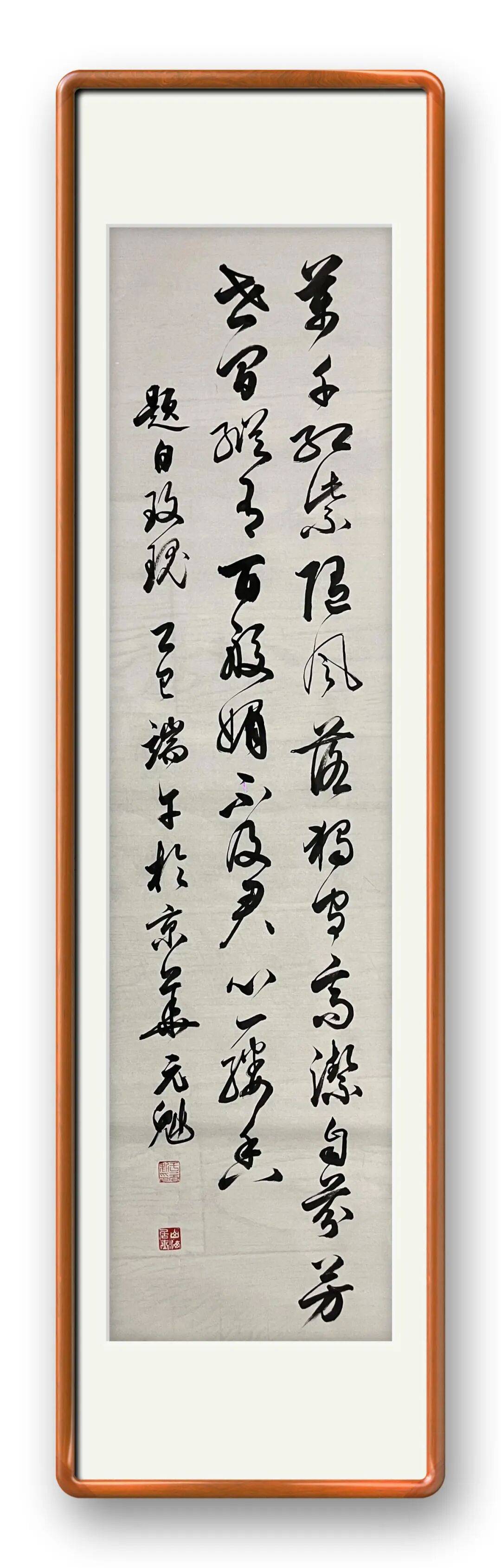 观于元魁老师书法,首先震撼于那磅礴大气的格局。无论是大幅的行草长卷,还是精雅的小品,都能感受到一种吞吐万象的气象。笔势随着诗意的流转而跌宕起伏。起笔沉稳,似山峦初显,带着雨后的清新与静谧;笔画渐趋灵动,线条的提按顿挫间,仿佛能看到月光透过松枝洒落、清泉在石上潺潺流淌的画面,将诗中的空灵意境通过书法的形式具象化,让观者在笔墨的律动中体悟山水之美与田园之趣。