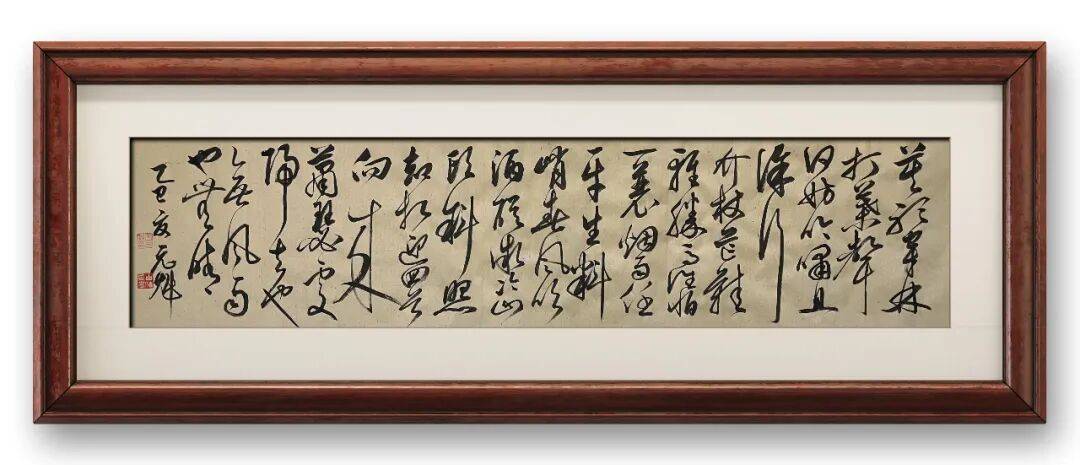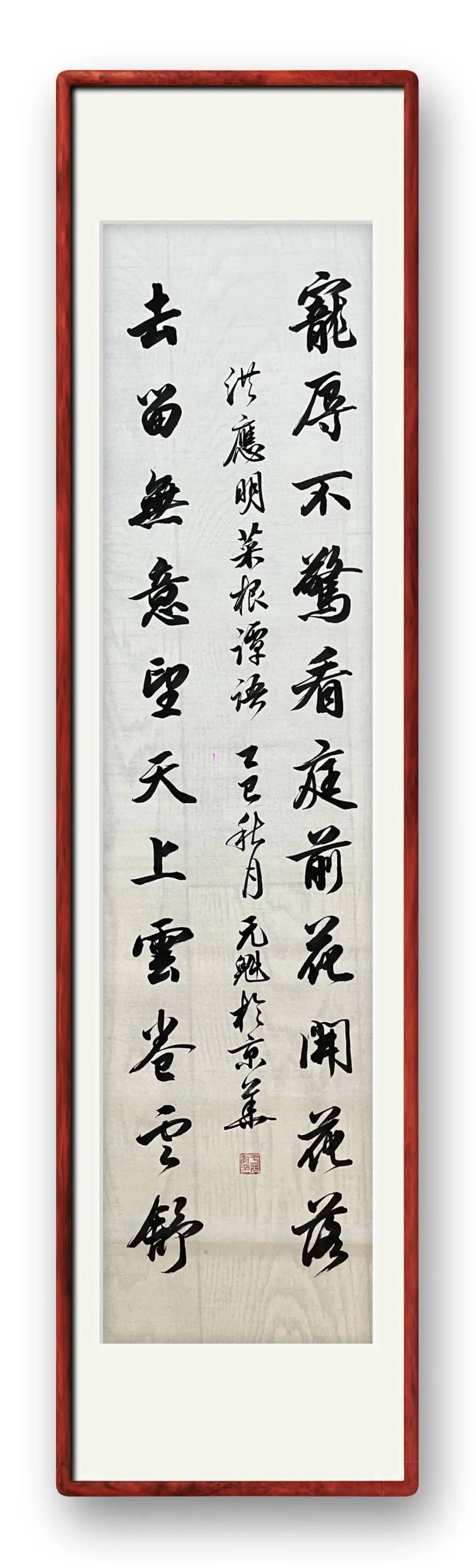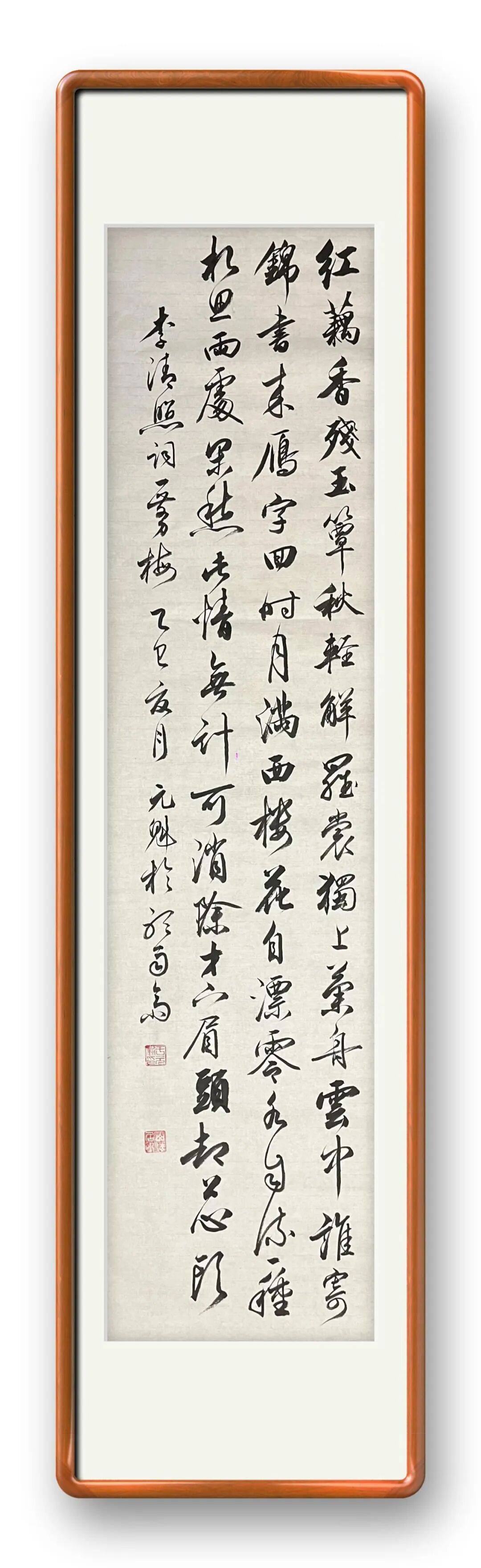 观于元魁老师书法,首先震撼于那磅礴大气的格局。无论是大幅的行草长卷,还是精雅的小品,都能感受到一种吞吐万象的气象。笔势随着诗意的流转而跌宕起伏。起笔沉稳,似山峦初显,带着雨后的清新与静谧;笔画渐趋灵动,线条的提按顿挫间,仿佛能看到月光透过松枝洒落、清泉在石上潺潺流淌的画面,将诗中的空灵意境通过书法的形式具象化,让观者在笔墨的律动中体悟山水之美与田园之趣。