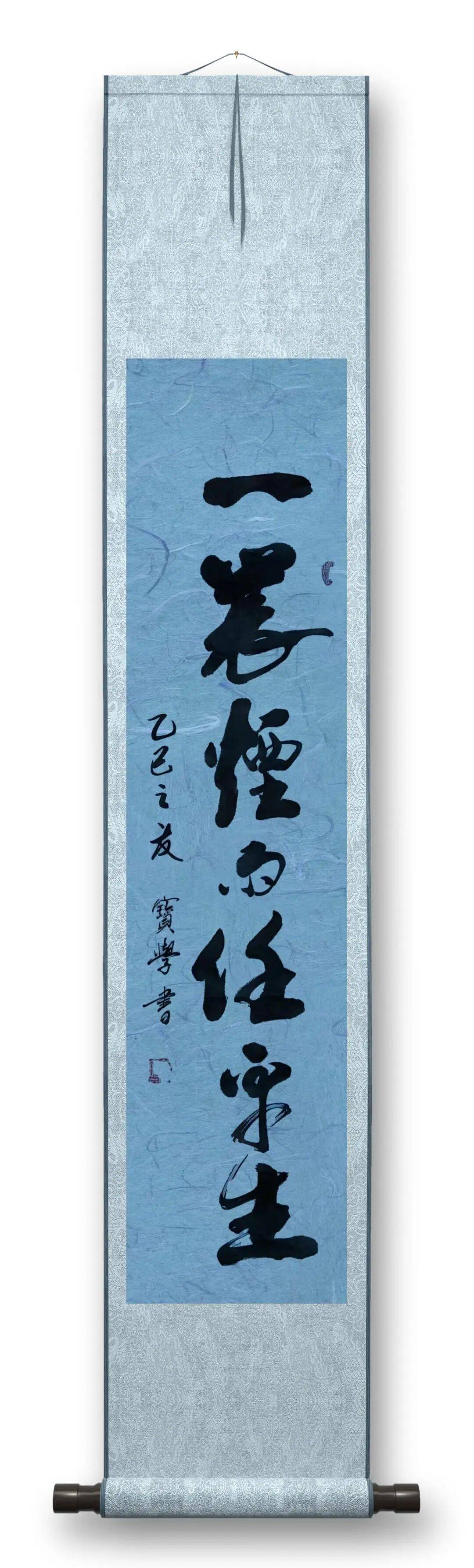 这幅书法作品以行书呈现“一蓑烟雨任平生”,尽显行书灵动酒脱之美。浅蓝色渐变宣纸为底,营造出淡雅、悠远的氛围,与文字意境相契合。从笔法看,笔画灵动流畅,“一”字简洁却有分提按转折间尽显功力。“蓑”“烟”等字笔画牵连,体现行书的量,连贯气韵;墨色浓淡变化自然,增添视觉层次与节奏感,让文字有了灵动的呼吸感。用笔既有飘逸之态,又不失沉稳,展现创作者对行书笔法的把控。结构上,字形大小错落、欹正相生,如“任”字的舒展、“生”字的收放使单字富有姿态,整体布局疏密得当,行列间呼应协调,呈现出行书自然随性又不失秩序的美感。落款“乙巳之夏 宝学书”及印章,补充创作信息,与正文相得益彰。印章的红色点缀,打破蓝色宣纸的单调,完善传统书法作品的形式,增添文化底蕴。内容“一蓑烟雨任平生”传递出豁达、超脱的人生态度,与行书的灵动结合,让作品兼具艺术美感与精神内涵。整体而言,这幅作品在笔法、结构、章法上融合得当,借行书之韵传递诗意哲思,是一幅富有感染力的行书佳作,观之可感受书法艺术与文字意境的交融,体会创作者的心境与笔墨功力。