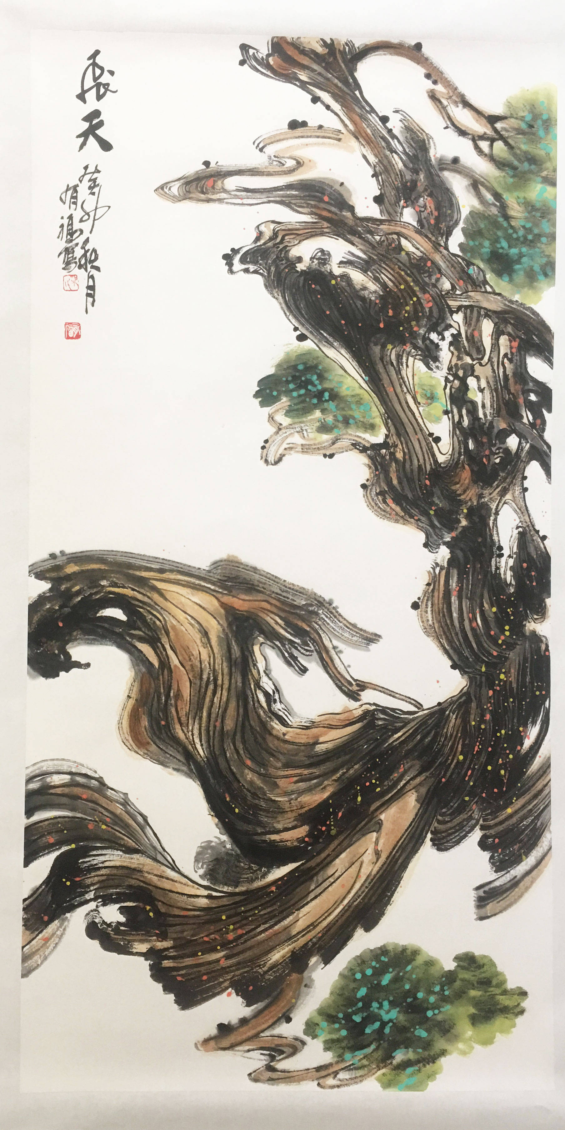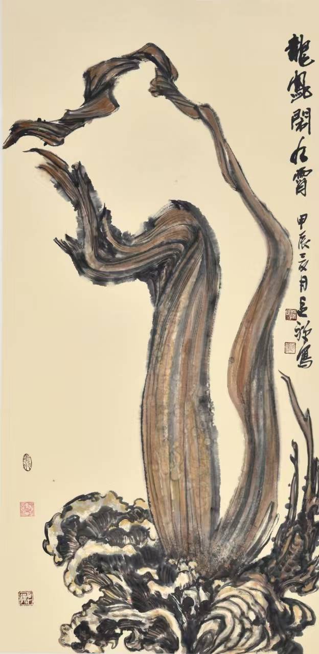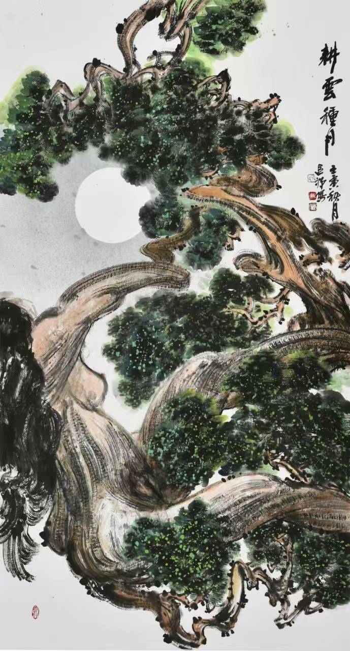 在构图方面,艺术家采用局部特写或仰视视角,突出崖柏的巍峨感。甚至借鉴西方超现实主义的空间处理,如《崖上春秋》系列,展现了其在构图上的创新意识。这种跨文化的艺术语言使他的作品既扎根传统,又具有当代性。